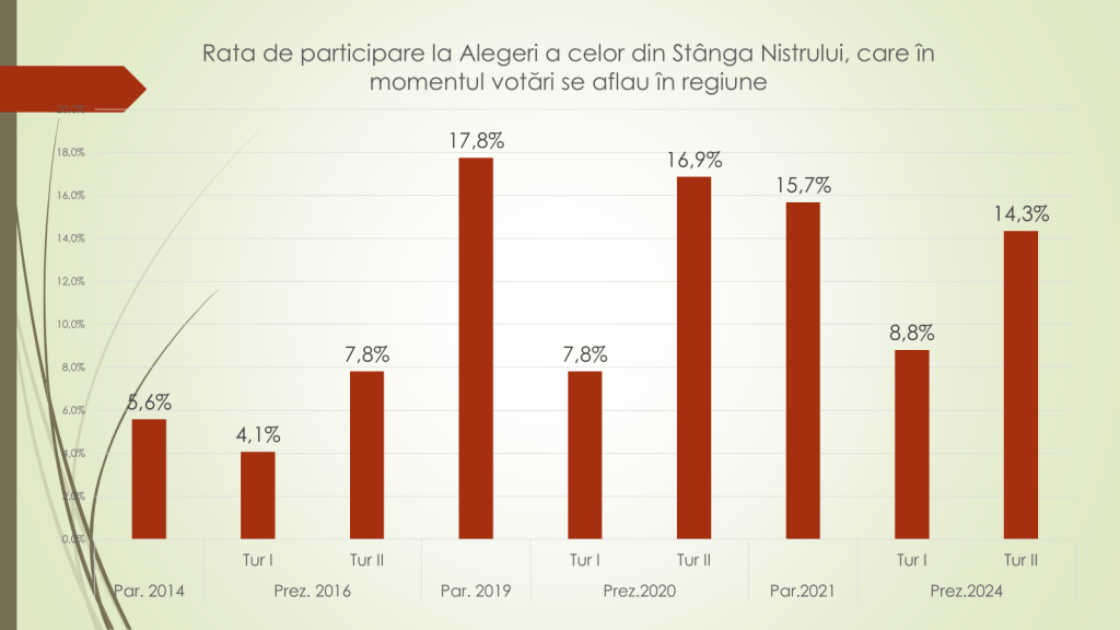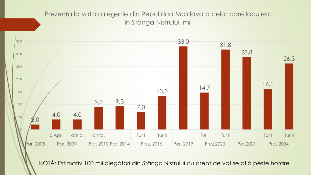Despre moldovenii din stânga Nistrului, economistul a afirmat că la alegerile parlamentare din 2014 aceștia au participat în număr de 9,3 mii de persoane, iar la cele din 2021 – 28,8 mii. Acum un an, la alegerile prezidențiale, turul întâi au participat 16,1 mi, iar în al doilea tur – 26,3 mii. „Sunt circa 100 de mii cetățeni ai regiunii transnistrene care au și cetățenia Republicii Moldova și se află peste hotare, în țările din UE. Un alt număr de 5-6 mii de persoane din stânga Nistrului merg la vot deoarece se văd cetățeni ai acestei țări și urmăresc activ viața politică din Republica Moldova. Alții nu se văd cetățeni ai Republicii Moldova, nu urmăresc viața politică de aici, dar în ajun de alegeri sunt îndemnați de anumite partide și anumiți candidați să iasă la vot. „Electoratul din stânga Nistrului este ignorat, izolat și desconsiderat”, a conchis economistul.
