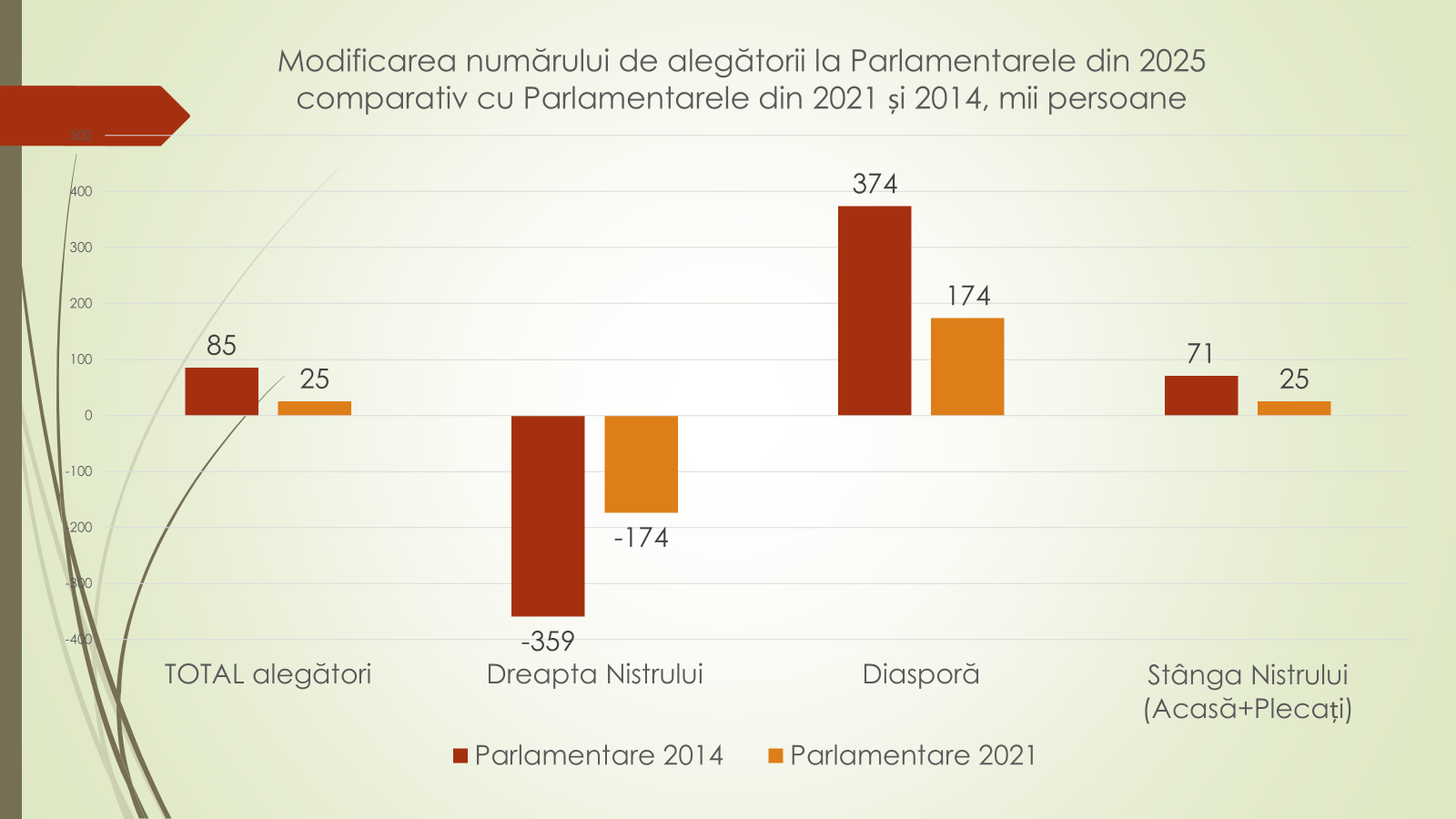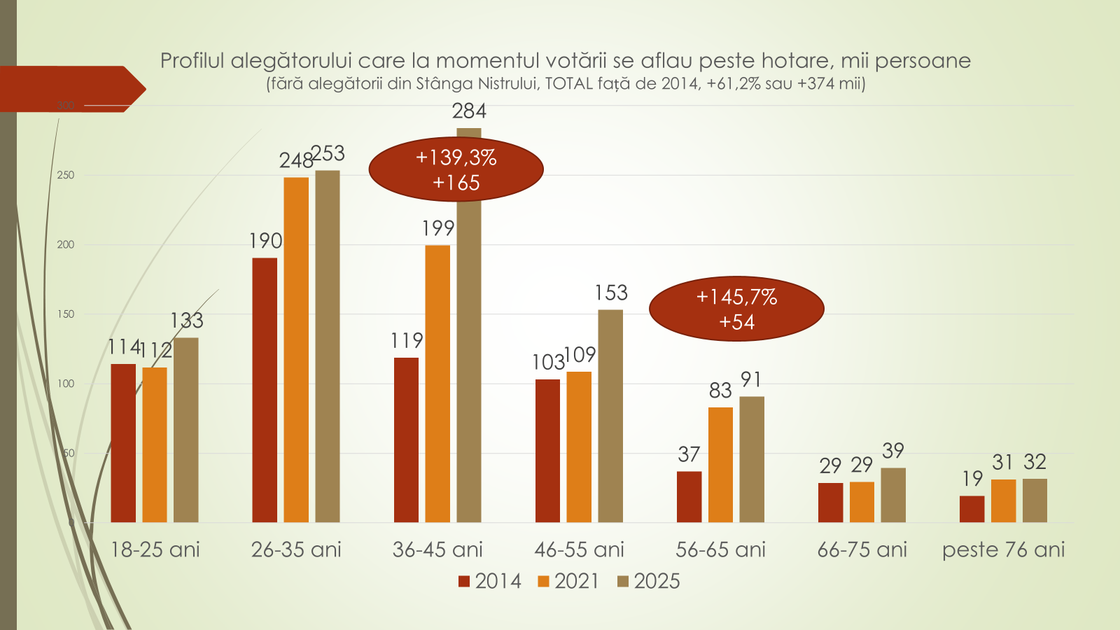Expertul susține că cea mai mare scădere a alegătorilor din dreapta Nistrului este atestată în rândul celor de la 18-25 de ani. La alegerile parlamentare din 2014 aceștia erau 372 de mii, iar pentru alegerile din toamnă sunt 171 de mii. O scădere de 54% sau de 201 mii, din cauza scăderii în general a numărului de copii, dar și al plecării lor tot mai intense peste hotare. Votanții de la 26 la 35 de ani au scăzut de la 450 de mii în 2014 la 294 de mii la alegerile din toamnă. Minus 34% sau minus 156 de mii de alegători. Unicul grup de vârstă care crescut în interiorul țării este 36-45 de ani. De la 361 de mii în 2014 la 367 de mii în 2025. Numărul alegătorilor de la 46-55 de ani a scăzut cu 83 de mii. De la 398 de mii în 2014 la 314 mii în 2025. Al celor de la 56 la 65 de ani a scăzut cu 39 de mii. De la 383 în 2014 la 344 în 2025. Votanții de la 66 la 75 de ani sunt în creștere cu 74,2% sau cu 125 de mii. De la 169 de mii în 2014 la 294 de mii în 2025. Cei de peste 76 de ani sunt în scădere, de la 114 mii în 2014 la 103 mii în 2025.