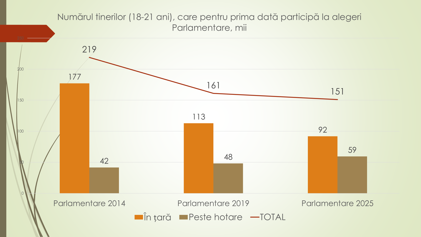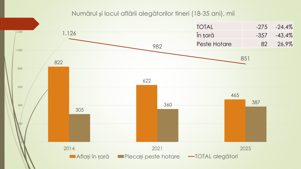 Economistul afirmă că numărul tinerilor moldoveni cade constant. În 2014 erau 1 milion și 126 de mii de tineri cu vârsta între 18 și 35 de ani. Dintre aceștia, 822 de mii erau în țară, iar 305 mii – plecați peste hotare. În prezent sunt 851 de mii de tineri, dintre care 465 de mii – în țară, iar 387 de mii – peste hotare. Față de 2014, la alegerile din această toamnă sunt cu 275 de mii de tineri mai puțini sau cu 24,4%. În țară numărul lor a scăzut cu 357 de mii, iar a celor de peste hotare a crescut cu 82 de mii.