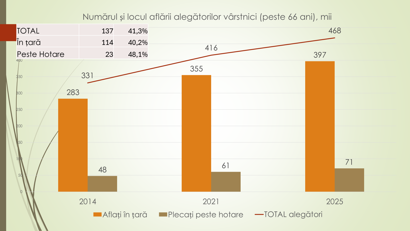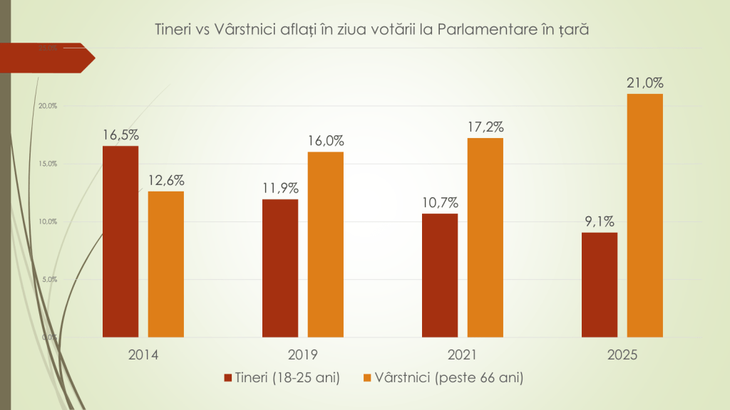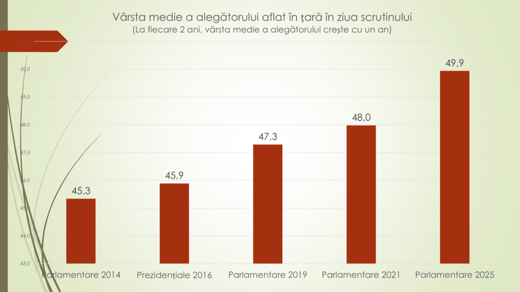 Totodată, declară analistul economic, numărul vârstnicilor este în creștere. Dacă la alegerile parlamentare din 2014 erau 331 de mii, la aceste alegeri sunt 468 de mii. Plus 137 de mii. Dacă în 2014 erau în țară 283 de mii de vârstnici, iar 48 de mii – peste hotare, la aceste alegeri, în țară sunt 397 de mii, iar peste hotare 71 de mii. Numărul a crescut în țară cu 114 mii, iar peste hotare – cu 23 de mii. „Tineri tot mai puțini și vârstnici tot mai mulți duce la creșterea medie a alegătorului. Dacă în 2014 era de 45,3 ani, în 2025 este de 49,9 ani. La următoarele alegeri, vârsta medie a alegătorului va depăși 50 de ani. Avem un electorat din ce în ce mai învârstă”, a declarat analistul economic.
