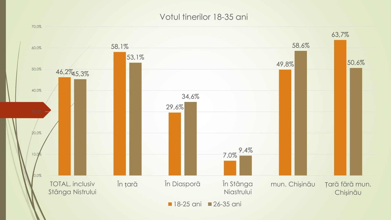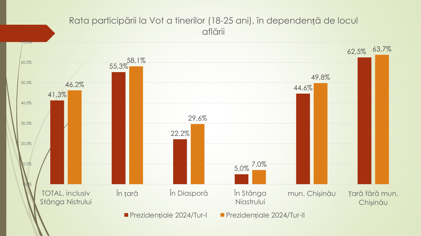 Expertul a mai spus că la alegerile prezidențiale din toamna trecută, tinerii Republicii Moldova de la 18 la 25 de ani, în total, în primul tur, au votat la nivel de 41,3%, iar în turul doi – 46,2%. Tinerii de pe malul drept al Nistrului au votat, în primul tur, în proporție de 55,3%, iar în turul doi – 58,1%. Din stânga Nistrului, în primul tur, au votat 5% dintre tinerii regiunii, iar în turul doi – 7%. Tinerii plecați din stânga Nistrului au votat, în primul tur, în proporție de 22,2%, iar în turul doi – 29,6%. Tinerii din Chișinău, în primul tur, au votat la nivel de 44,6%, iar în turul doi – 49,8%.