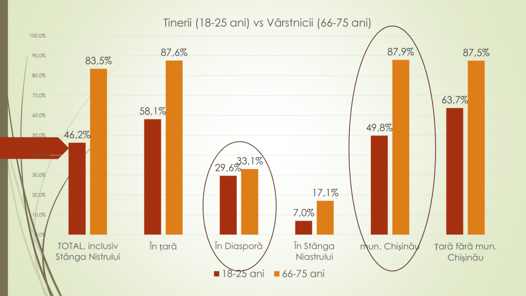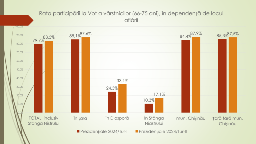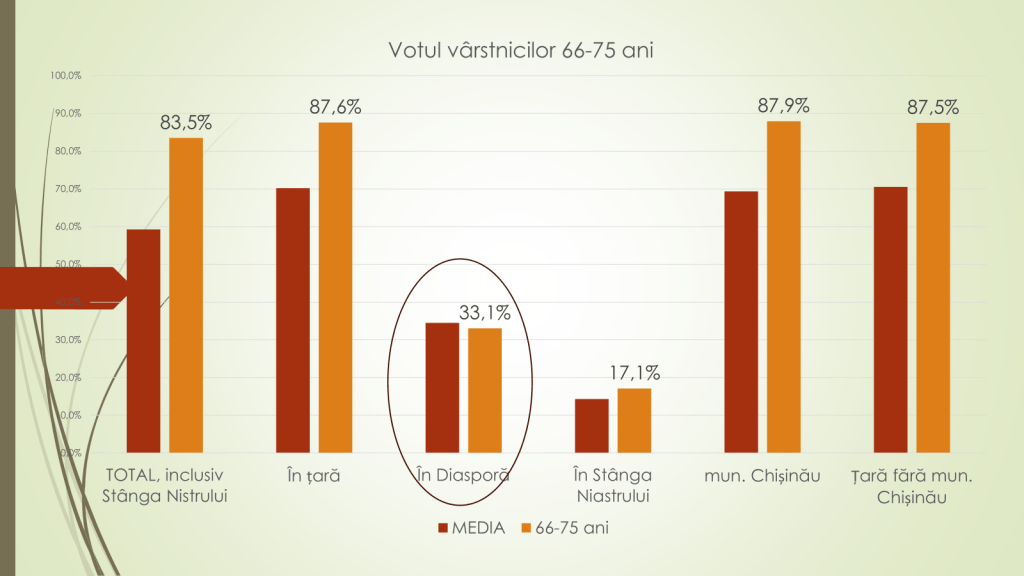 Cu referire la vârstnici, economistul a menționat că în total, în primul tur, au votat 79,7% dintre aceștia, iar în turul doi – 83,5%. De pe malul drept al Nistrului au votat, în primul tur, 85,1%, iar în turul doi – 87,6%. Din stânga Nistrului, în primul tur, au votat 10,3% dintre locuitori vârstnici ai regiunii, iar în turul doi – 17,1%. Vârstnicii plecați din stânga Nistrului au votat, în primul tur, în proporție de 24,3%, iar în turul doi – 33,1%. Vârstnicii din Chișinău, în primul tur, au votat 84,4%, iar în turul doi – 87,9%. „Cei mai activi alegători sunt cei de la 66 la 75 de ani. 9 din 10 au mers la vot la alegerile prezidențiale de acum un an. Aceștia, indiferent unde locuiesc, votează foarte activ”, a menționat economistul.