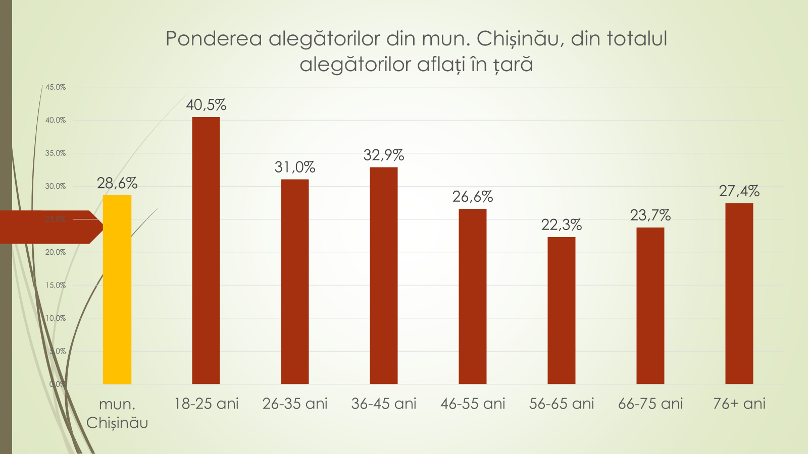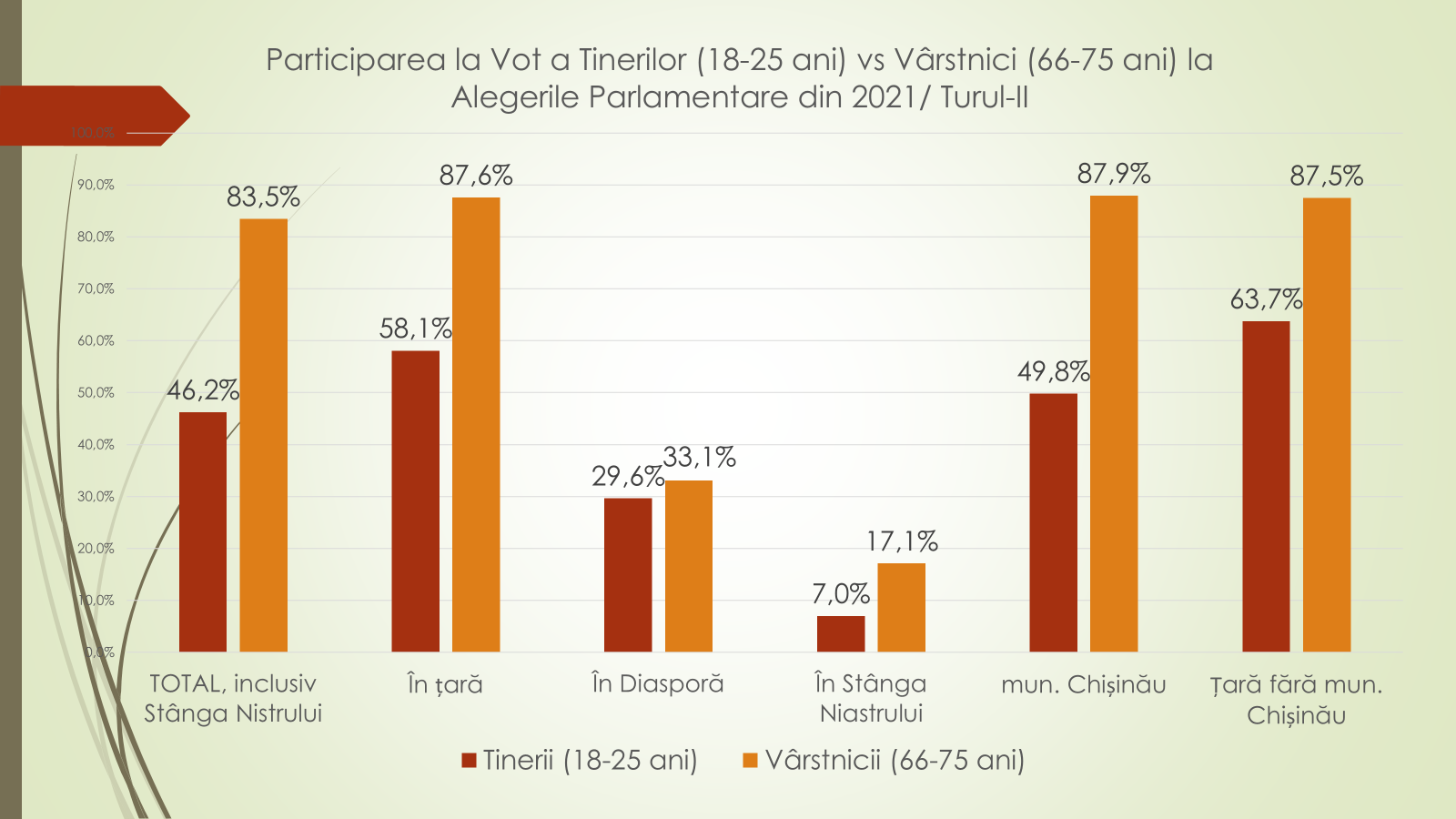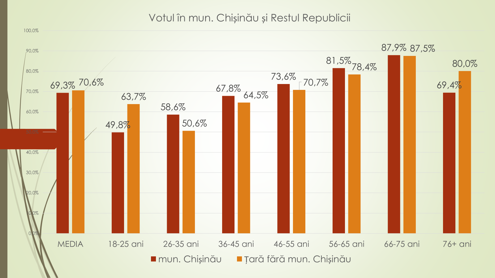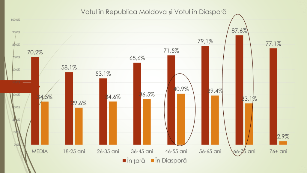 Analistul economic mai afirmă că în țară și în stânga Nistrului, între votul tinerilor și al vârstnicilor, este o diferența semnificativă. În diasporă, diferența aproape că lipsește. Prezența la vot a tuturor categoriilor de votanți este aproape egală. Dacă în țară, tinerii votează relativ bine, în municipiul Chișinău aceștia au o prezență mai slabă la urnele de vot în ziua alegerilor și este legat de faptul că sunt mai mulți. „Două grupe de vârstă se manifestă mai activi la alegeri. Tinerii, care au cea mai slabă prezență la vot, și vârstnicii de peste 65 de ani, care sunt cei mai activi. Cu cât vârsta este mai înaintată cu atât prezența la vot este mai bună. În diasporă este o mică diferență”, a afirmat analistul economic.