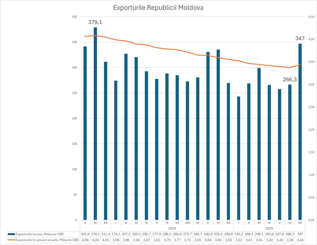 În iunie 2025 exporturile însumau 266 milioane USD, dar în iulie au urcat la 347 milioane USD. Este un salt de +81 milioane într-o singură lună – echivalent cu +30% față de iunie și +22% comparativ cu iulie 2024.