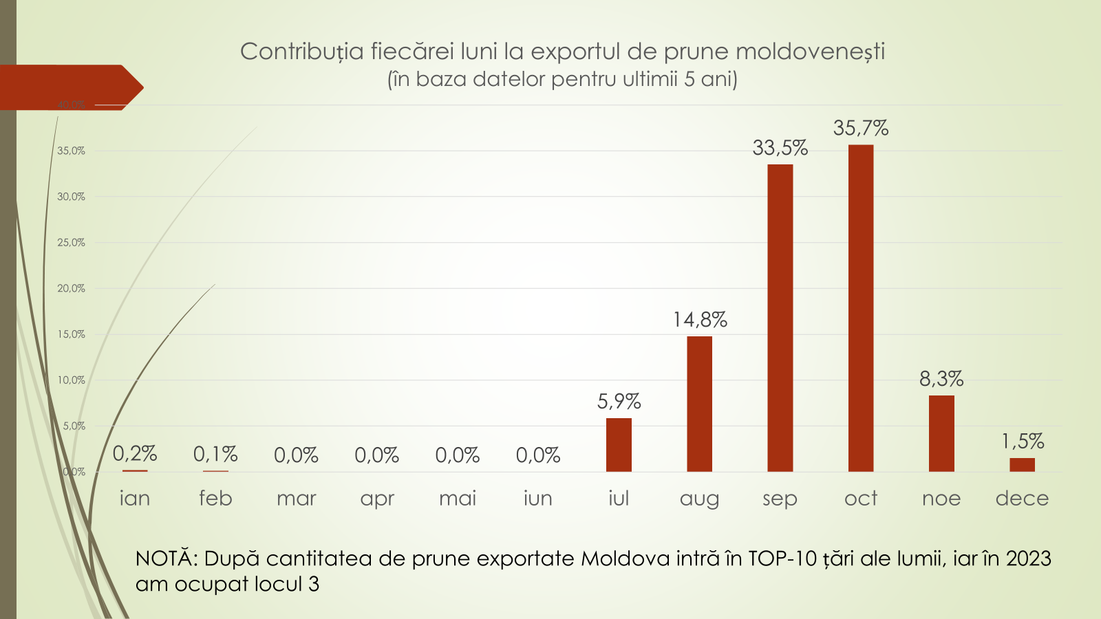 „70% din toate prunele moldovenești sunt exportate în luna septembrie (33,5%) și octombrie (35,7%). La noi sezonul recoltei prunelor începe când recoltetele din alte țări, din UE inclusiv, se termină. În felul acesta este prleungit consumul de prune în Europa.”, a declarat expertul.