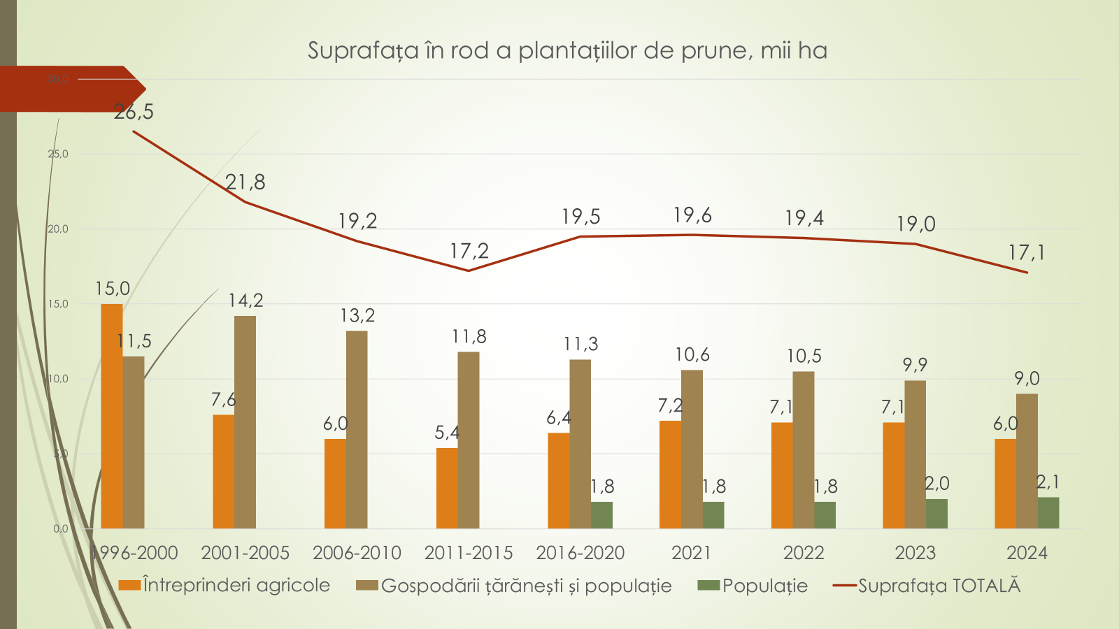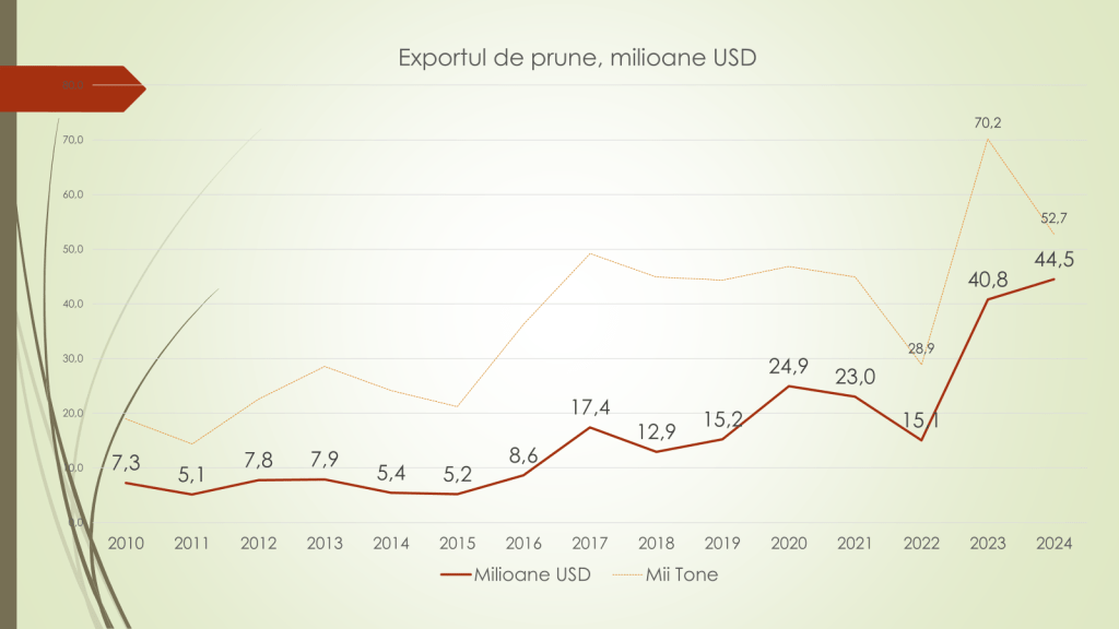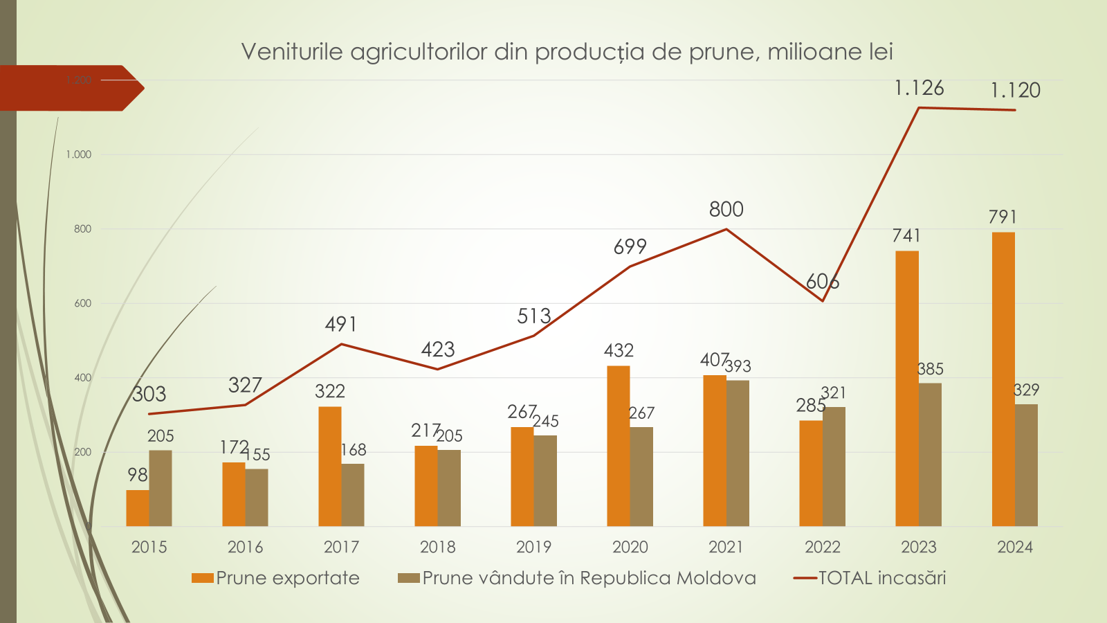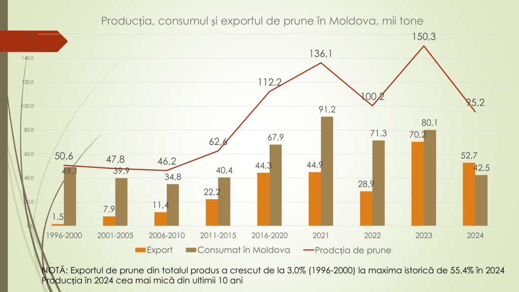 Potrivit lui Veaceslav Ioniță, în perioada 1996/2000, Republica Moldova avea 26,5 mii/ha de plantații cu prune, iar în 2024 s-au înregistrat 17,1 mii/ha de plantații. Astfel, există un potențial mare de creștere și dezvoltare a acestei ramuri. Deși în 2024 a fost înregistrată și cea mai mică roadă din ultimii zece ani, a fost exportat cel mai mare volum de prune. „Pentru prima dată în istoria țării, în 2024 s-au exportat mai multe prune decât s-a consumat local. În anii 2000 Republica Moldova exporta doar 3% din volumul pronelor recoltate. Practic toate prunele crescute în țară erau destinate consumului local. În 2024 s-au exportat 55% din recolta de prune moldovenești”, a spus Veaceslav Ioniță.