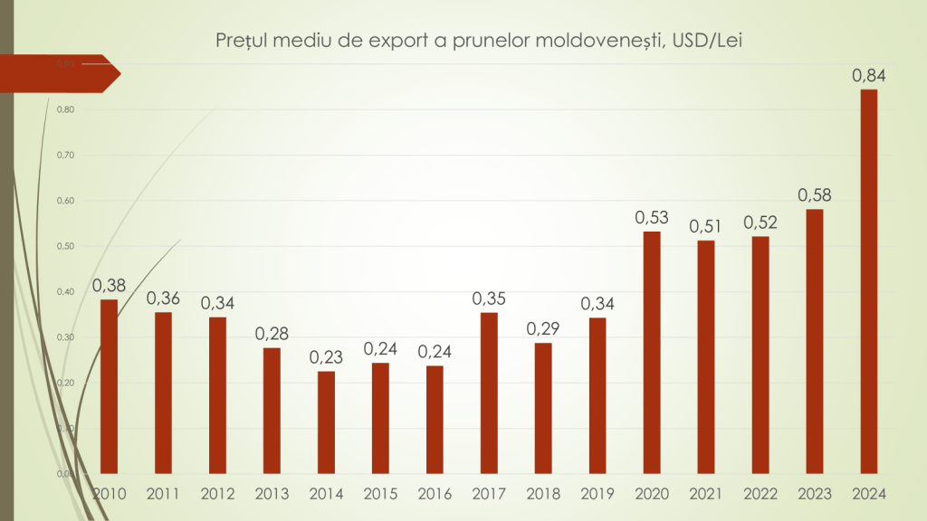 Analistul economic a menționat că dacă în 2015 prețul mediu de export al prunelor moldovenești era de 0,24 de dolari/kg, în 2024 a ajuns la 0,84 de dolari/kg. Astfel, în 2024 a fost înregistrată cea mai bună conjunctură internațională. „Suportul pe care l-am primit de la partenerii externi a dus la ceea că Republica Moldova s-a poziționat destul de bine ca producător și exportator de fructe și am avut o creștere spectaculoasă a prețurilor de export, datorită noilor piețe de desfacere, deși am avut roadă mai mică și volume de export mai mici”, a menționat analistul economic.
