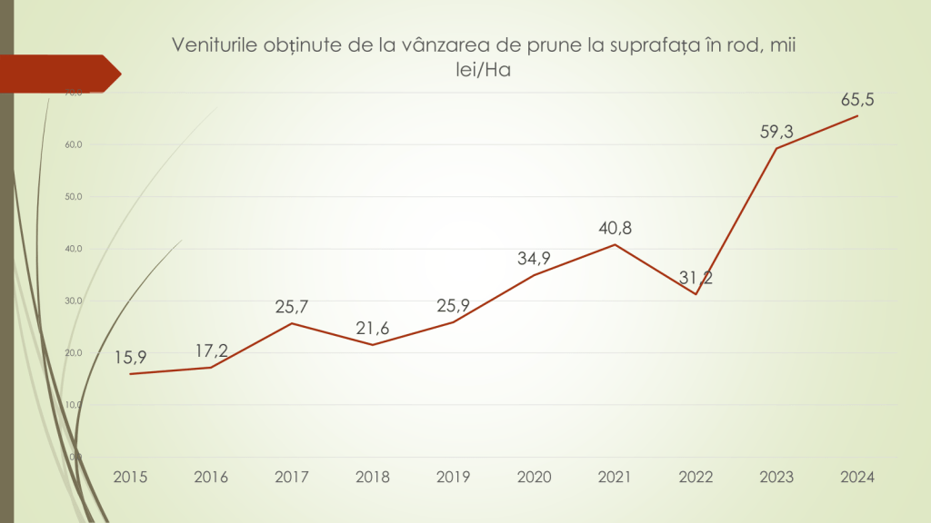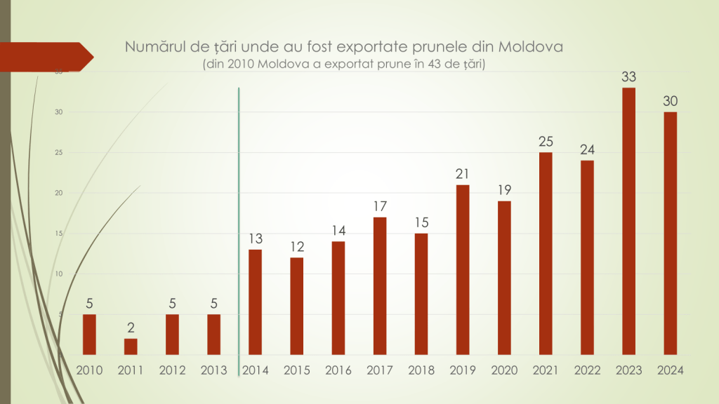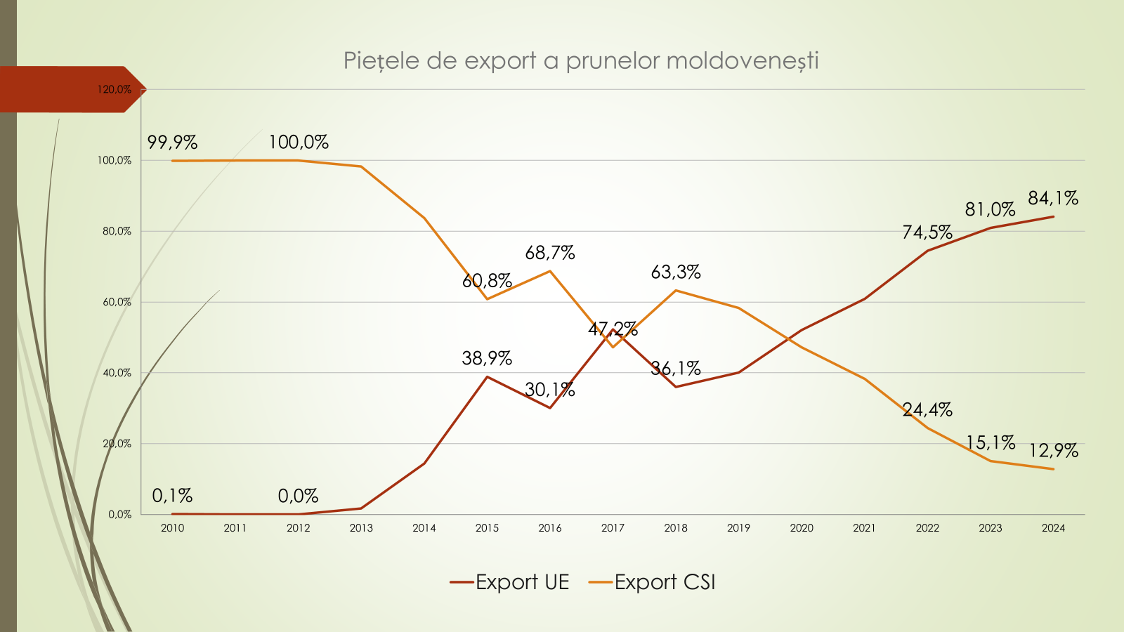 Expertul a mai spus că în 2020, veniturile agricultorilor din realizarea producției de prune, au totalizat 690 de milioane de lei, iar în 2024 – 1 miliard și 120 de milioane de lei. În mare parte din contul prunelor exportate, deși a fost înregistrată cea mai mică roadă. Dacă în 2015 câștigul din vânzarea prunelor a fost de 16 mii/lei/ha, în 2024 a ajuns la 65,5 mii/lei/ha. Dacă până în 2013 Republica Moldova exporta prune în două-trei țări, din 2014, când Federația Rusă a impus embargou fructelor moldovenești, Moldova și-a diversificat masiv piețele de desfacere. În 2023, a exportat prune în 33 de țări, iar în 2024, din cauza unei recolte mai mici, prunele moldovenești au ajuns în 30 de țări. În 2012, aproape toate prunele moldovenești mergeau către CSI. După 2014 lucrurile s-au inversat. În 2024, în UE au ajuns circa 85% din prunele moldovenești. „UE înseamnă volume de export mai mari, UE înseamnă prețuri mai bune de export și înseamnă o piața mare de desfacere”, a spus expertul.