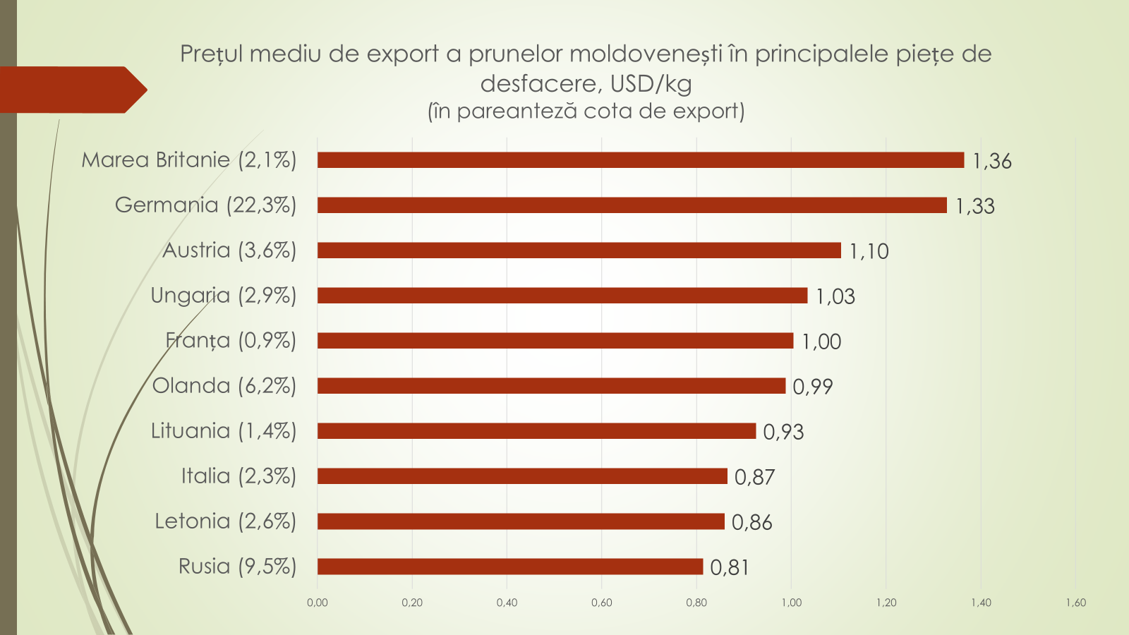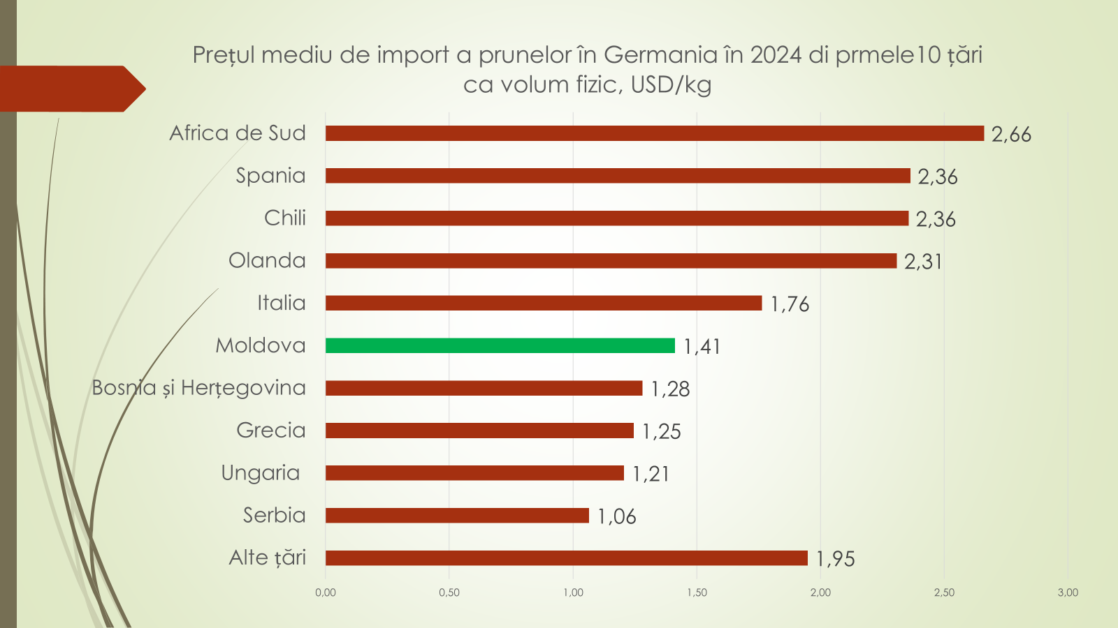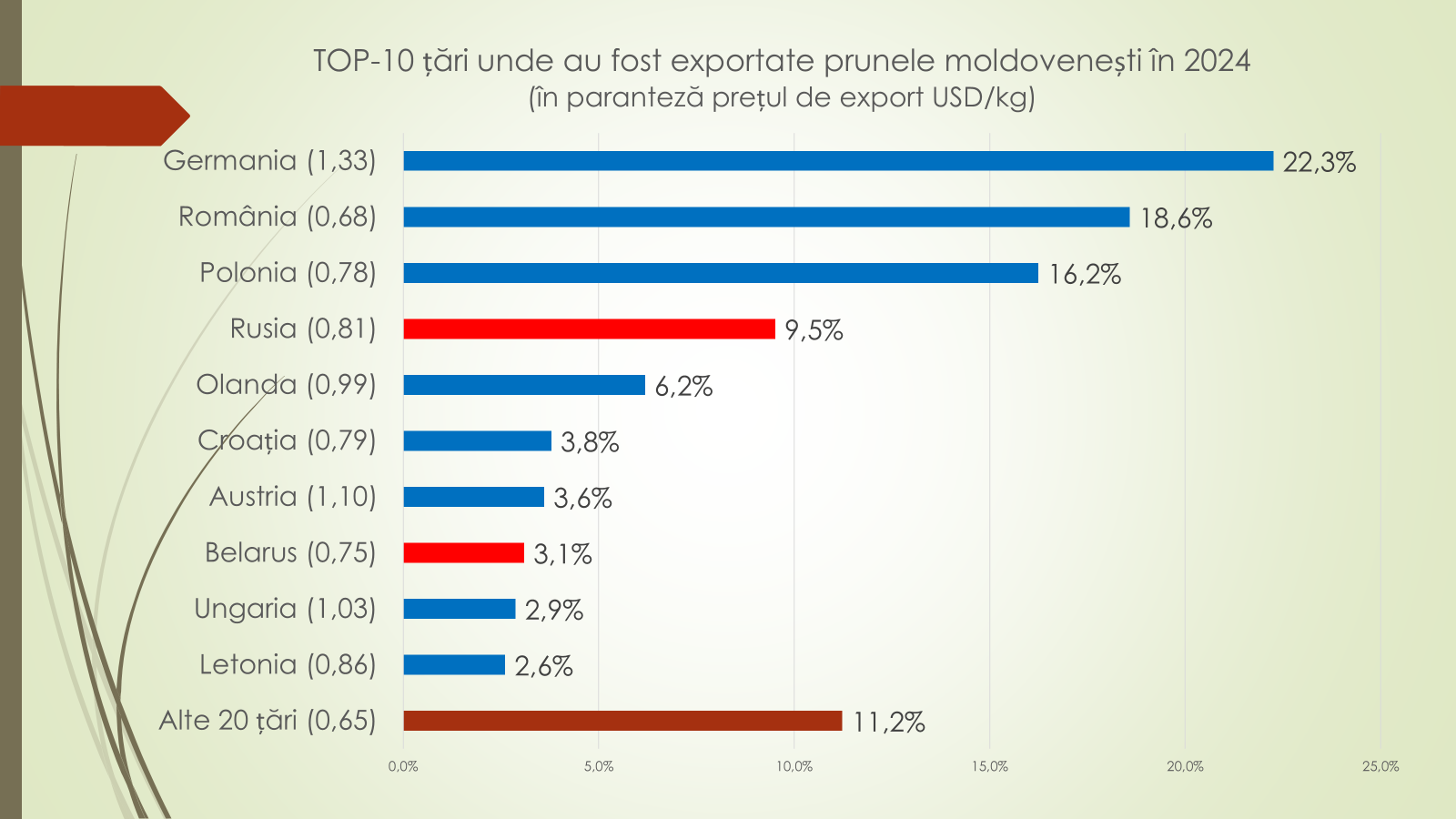 Țările unde au fost exportate în 2024 prunele moldovenești au fost Germania cu o cotă de 22,3%; România – 18,6%; Polonia – 16,2%; Rusia – 9,5%; Olanda – 6,2%. Restul țărilor sub 4%. Față de 2023, în 2024 cota de export către Germania a crescut, dar și prețul de export, cu 35%. „Clar se vede că Germania este o piață apreciată de către exportatorii moldoveni de prune. România este deja o piață tradițională. Polonia este în creștere în preferințele agricultorilor noștri. Cel mai bun preț a fost în 2024 în Marea Britanie – 1,36 de dolari pentru un kilogram, dar cota de export a fost de doar 2%. Către Germania a fost, la fel, unul dintre cele mai bune prețuri – 1,33 de dolari pentru un kilogram, pentru o cotă de 22,3%.