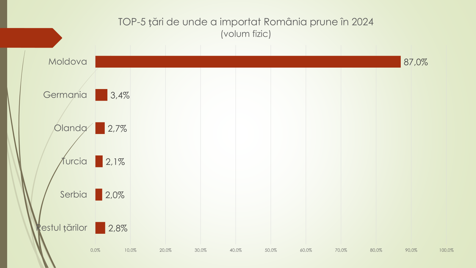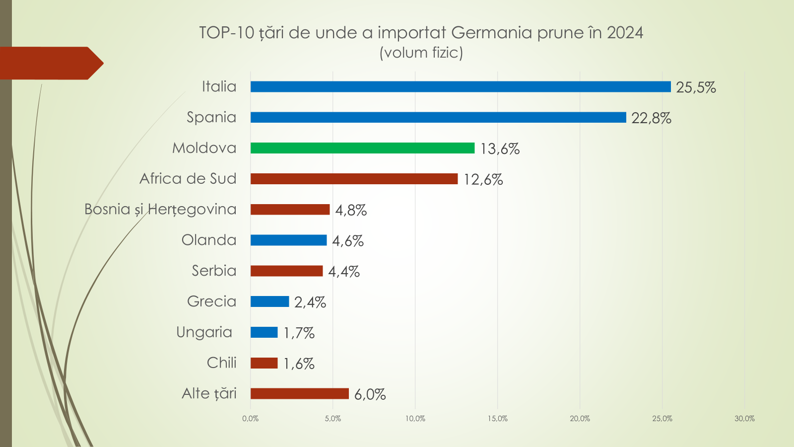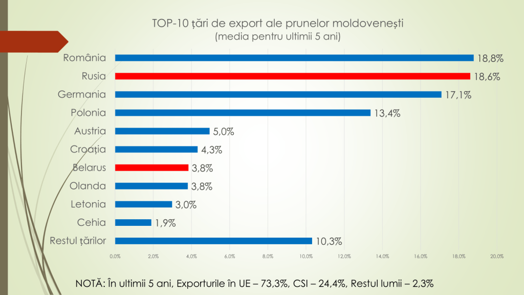 Țările unde au fost exportate în 2024 prunele moldovenești au fost Germania cu o cotă de 22,3%; România – 18,6%; Polonia – 16,2%; Rusia – 9,5%; Olanda – 6,2%. Restul țărilor sub 4%. Față de 2023, în 2024 cota de export către Germania a crescut, dar și prețul de export, cu 35%. „Clar se vede că Germania este o piață apreciată de către exportatorii moldoveni de prune. România este deja o piață tradițională. Polonia este în creștere în preferințele agricultorilor noștri. Cel mai bun preț a fost în 2024 în Marea Britanie – 1,36 de dolari pentru un kilogram, dar cota de export a fost de doar 2%. Către Germania a fost, la fel, unul dintre cele mai bune prețuri – 1,33 de dolari pentru un kilogram, pentru o cotă de 22,3%.