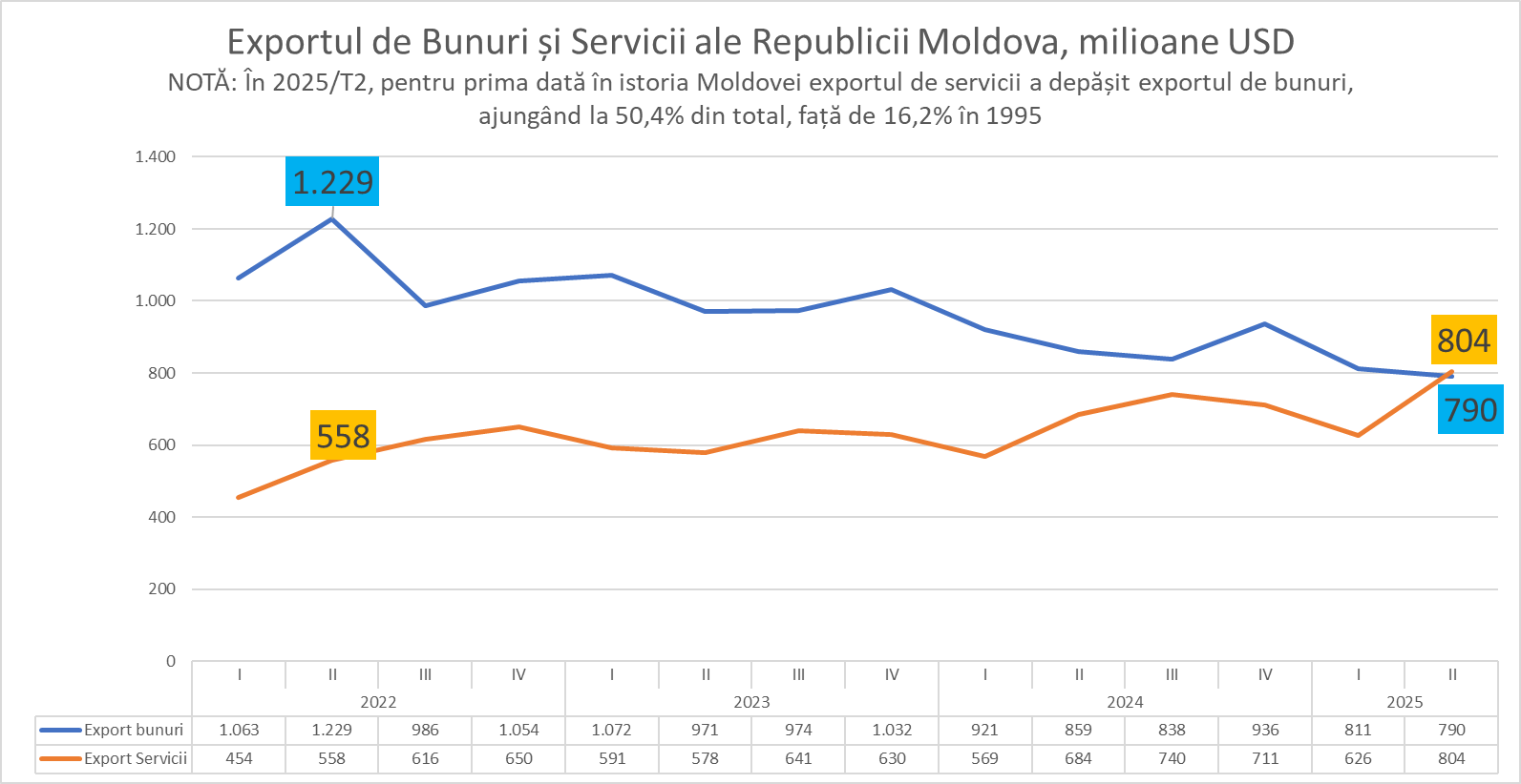 Un eveniment istoric s-a produs în trimestrul II al anului 2025: exportul de servicii al Republicii Moldova (804 milioane USD) a depășit pentru prima dată exportul de bunuri (790 milioane USD). Este un prag simbolic, dar extrem de important. El marchează începutul unei noi etape economice, în care Moldova trece treptat de la o economie bazată pe bunuri materiale la o economie a serviciilor și cunoașterii.