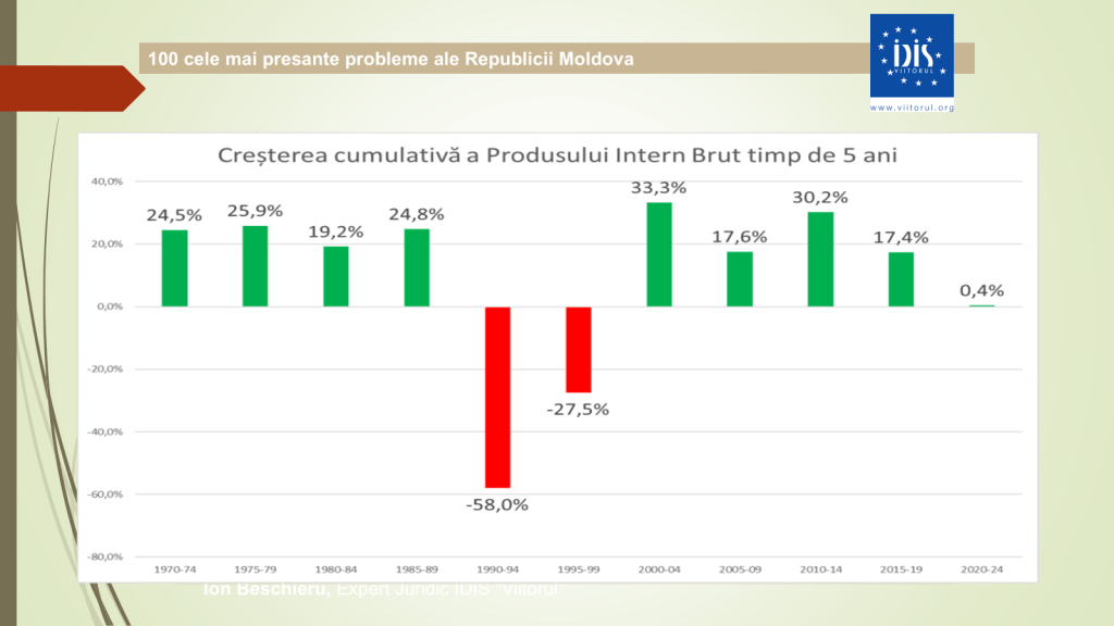 „În ultimii cinci ani, PIB-ul Republicii Moldova a crescut cu doar 0,4%. Pentru 2025 prognozăm o creștere de cel mult 1%, ceea ce înseamnă practic stagnare. Mai rău decât atât a fost doar în anii ’90, în perioada colapsului sistemului sovietic”, a spus Veaceslav Ioniță.