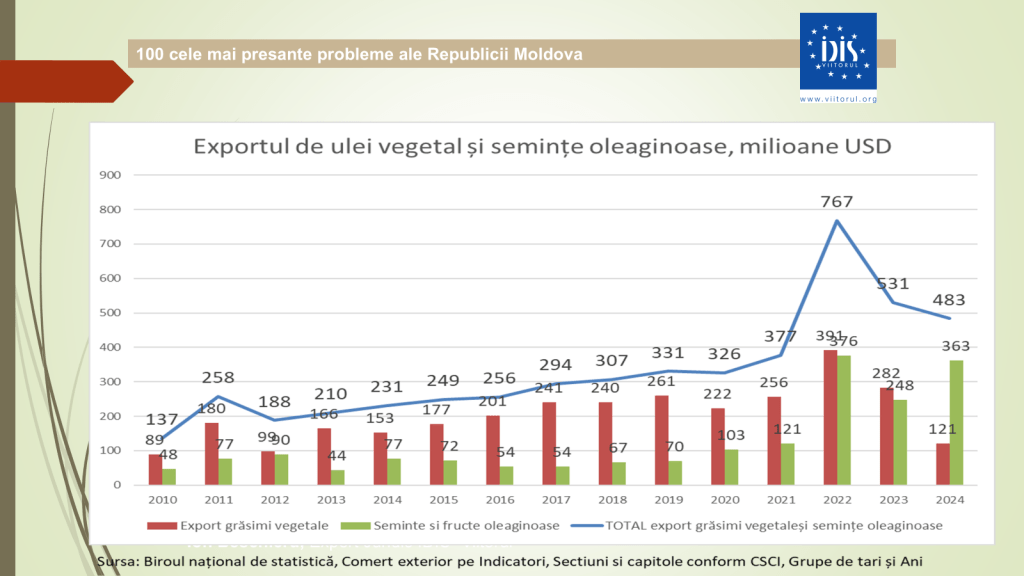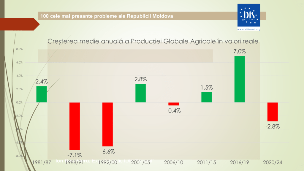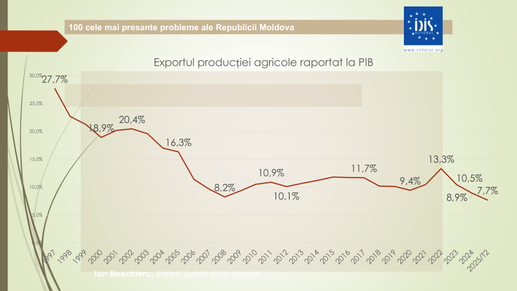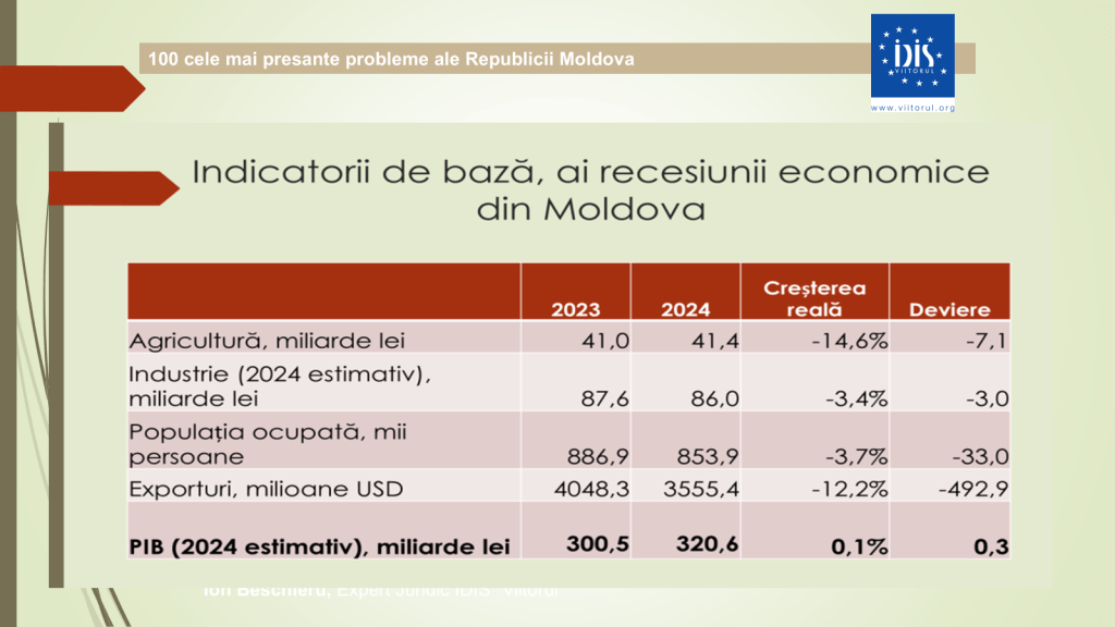 Potrivit expertului, datele economice pentru 2024 indică o scădere de 14,6% în agricultură sau aproximativ 7 miliarde de lei, și o pierdere de circa 3 miliarde de lei în industrie. În ultimii cinci ani, producția industrială s-a redus cu 1,3%, iar agricultura – cu 2,8%. Totodată, exporturile au scăzut cu aproape 500 de milioane de dolari, iar tendința negativă continuă și în 2025. „Astăzi exportăm materie primă și importăm produse finite. Din exportatori de ulei am devenit exportatori de floarea-soarelui și importatori de ulei. Balanța agricolă a devenit negativă, ceea ce nu s-a mai întâmplat de decenii”, a declarat expertul.