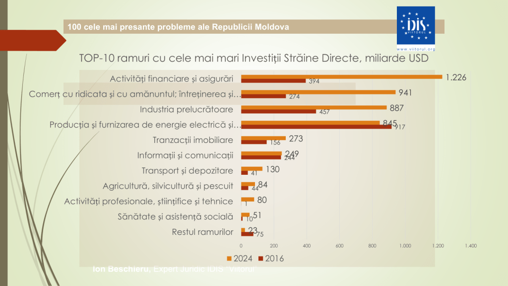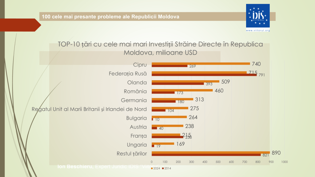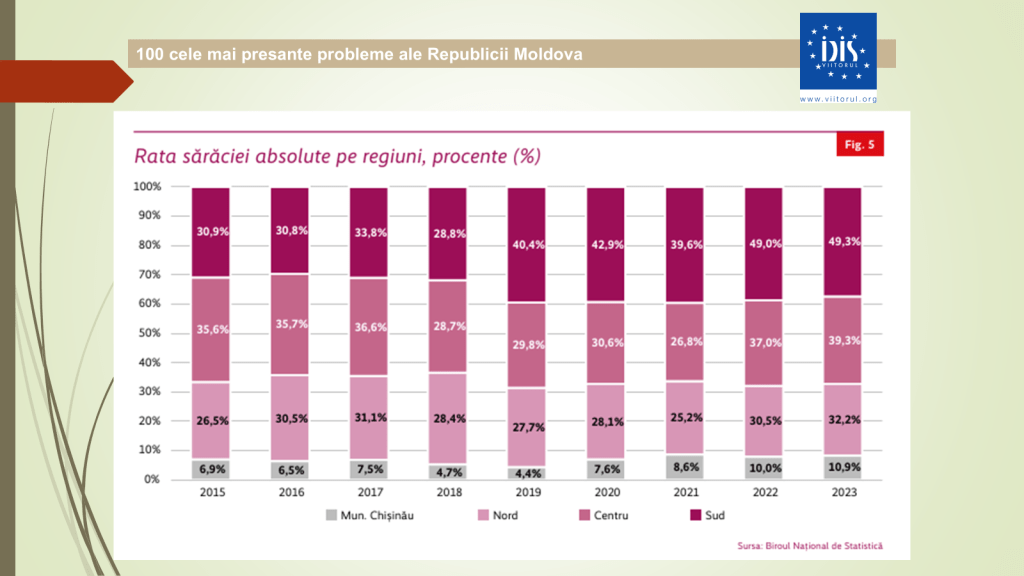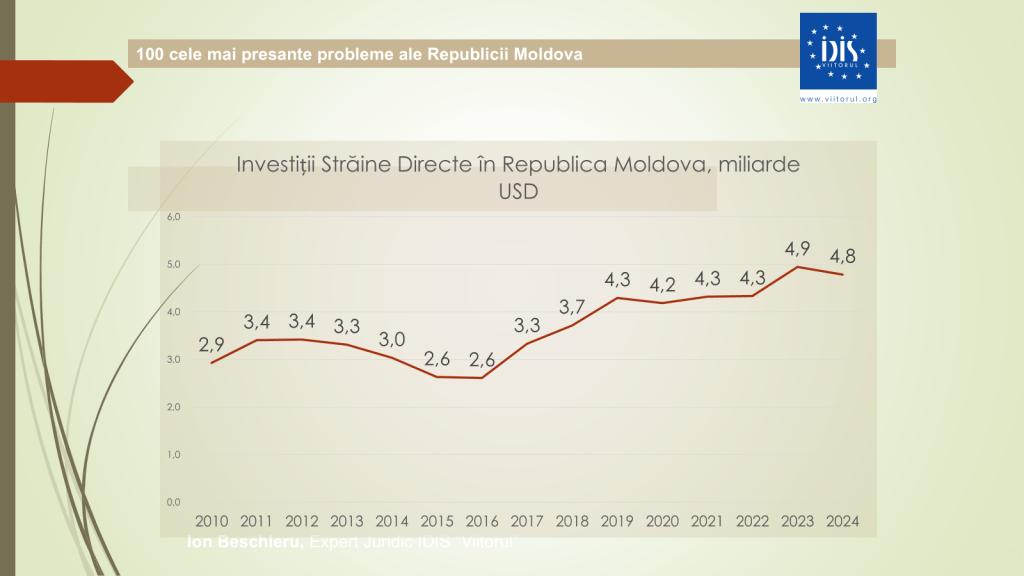 Analistul economic menționează că rata sărăciei absolute a crescut semnificativ. Dacă în sud, acum zece ani, rata sărăciei era de 31%, astăzi a ajuns la aproape 50%. În nord s-a majorat de la 26,5% la 32,2%, iar în Chișinău – de la 7% la 11%. Investițiile străine directe au scăzut ușor, de la 4,9 miliarde de dolari în 2023 la 4,8 miliarde de dolari în 2024, însă, totuși, Republica Moldova rămâne țara cu cele mai mici investiții străine pe cap de locuitor din Europa de Est.