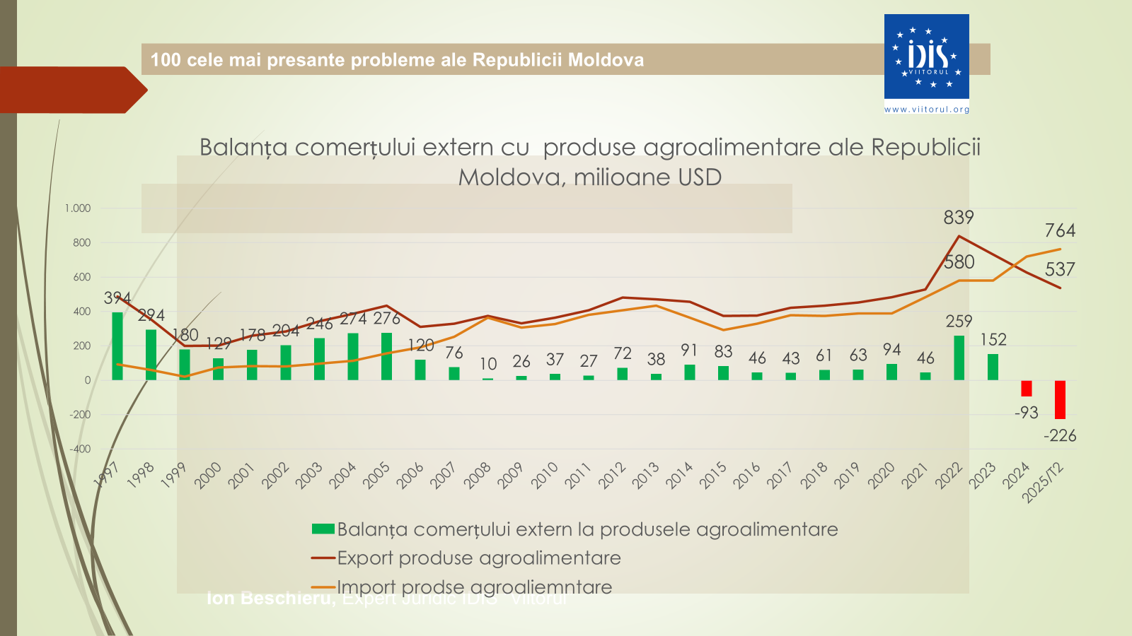 Potrivit expertului, datele economice pentru 2024 indică o scădere de 14,6% în agricultură sau aproximativ 7 miliarde de lei, și o pierdere de circa 3 miliarde de lei în industrie. În ultimii cinci ani, producția industrială s-a redus cu 1,3%, iar agricultura – cu 2,8%. Totodată, exporturile au scăzut cu aproape 500 de milioane de dolari, iar tendința negativă continuă și în 2025. „Astăzi exportăm materie primă și importăm produse finite. Din exportatori de ulei am devenit exportatori de floarea-soarelui și importatori de ulei. Balanța agricolă a devenit negativă, ceea ce nu s-a mai întâmplat de decenii”, a declarat expertul.