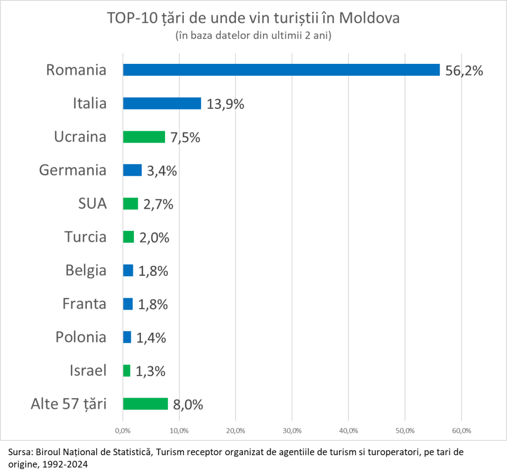 Pe locul 3: Ucraina. Și aici trebuie precizat clar: vorbim despre turiști, nu refugiați. Chiar și în vreme de război, o parte dintre ucraineni caută câteva zile de repaus, iar o parte dintre ei aleg Moldova. Nu sunt mulți, dar sunt suficient de relevanți ca să intre în top.