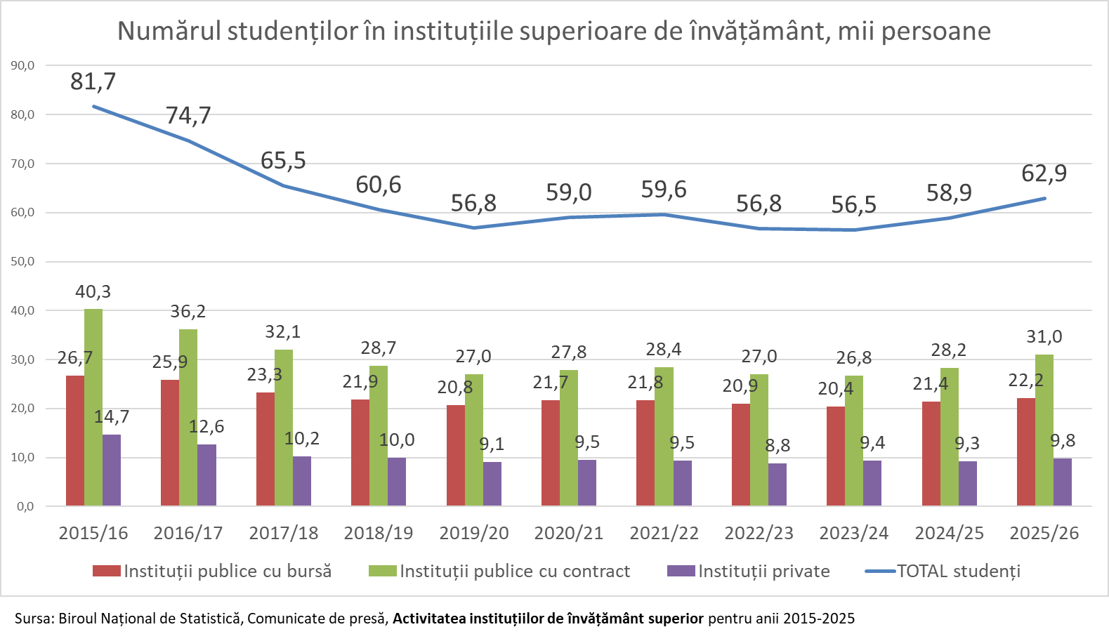 În anul universitar 2023–2024, am atins cel mai mic nivel al ultimilor 30 de ani: doar 56,5 mii de studenți, față de aproximativ 128 de mii în perioada de vârf 2007–2008. Astăzi, în 2025–2026, avem 62,9 mii de studenți.