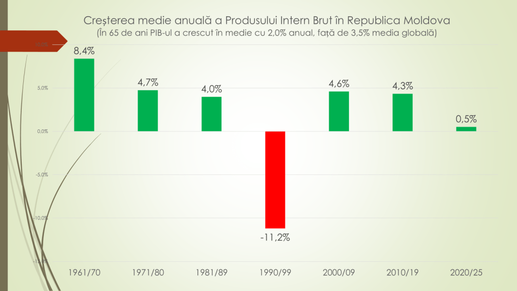 Potrivit estimărilor expertului, Produsul Intern Brut (PIB) va înregistra în 2025 o creștere de 2,7%, comparativ cu doar 0,1% în 2024, evoluție determinată în mare parte de recuperarea sectorului agricol. Cu toate acestea, PIB-ul Republicii Moldova nu va atinge nici în acest an nivelul de dinaintea războiului declanșat de către Federația Rusă împotriva Ucrainei. Creșterea medie anuală a PIB-ului în ultimii cinci ani a fost de doar 0,5%, semnificativ sub media globală.