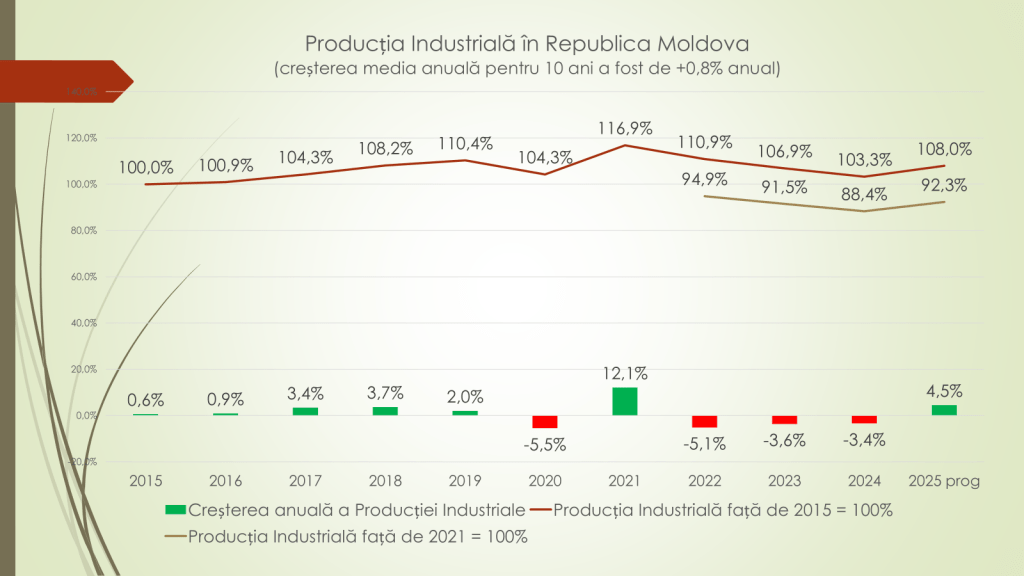 Producția industrială este estimată să crească în 2025 cu 4,5%, după trei ani de declin. Chiar și așa, nivelul producției industriale va rămâne la aproximativ 92% față de maximul istoric din 2021, iar în ultimii zece ani creșterea cumulată a fost de doar 8%, o evoluție catalogată drept îngrijorătoare. În agricultură, după o scădere accentuată în 2024, este anticipată o recuperare de circa 15% în 2025. Expertul atrage însă atenția asupra dependenței excesive de condițiile climatice, subliniind necesitatea dezvoltării zootehniei și a procesării produselor agricole cu valoare adăugată înaltă, pentru a reduce vulnerabilitatea sectorului.