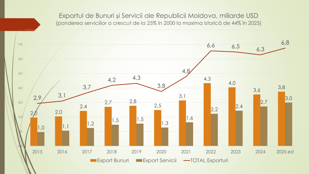 Pe piața muncii, populația ocupată continuă să scadă, cu un minus de 77 de mii de persoane în ultimii doi ani, în special în sectorul agrar, fenomen alimentat de migrația externă. În schimb, numărul salariaților ar putea crește în 2025 cu aproximativ 10 mii de persoane. Exporturile de bunuri și servicii vor atinge în acest an circa 6,8 miliarde de dolari, după doi ani de declin. Pentru prima dată în istoria țării, exporturile de servicii vor depăși 3 miliarde de dolari, fiind principalul motor al creșterii, în timp ce exporturile de bunuri se vor apropia de 3,8 miliarde de dolari, înregistrând o revenire modestă.