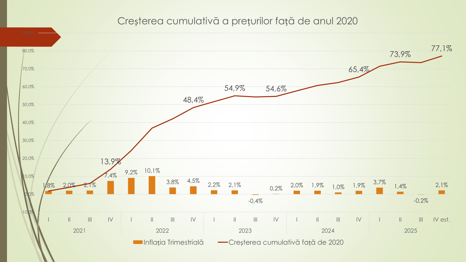 Salariul mediu lunar este estimat la 15.700 de lei, cu o creștere reală de 4,1%, în timp ce pensia medie pentru limită de vârstă a depășit pentru prima dată pragul de 4.000 de lei, ajungând la 4.200 de lei. Totuși, inflația ridicată din ultimii ani a diminuat semnificativ impactul acestor majorări. Rata inflației este estimată la 7,1% în 2025, nivel considerat ridicat, dar mult sub vârful de 34% din 2022. În lipsa unor factori majori de presiune, inflația ar putea coborî spre 5% în 2026. Din 2020 până în prezent, prețurile au crescut cumulativ cu 77%, afectând puternic puterea de cumpărare a populației.