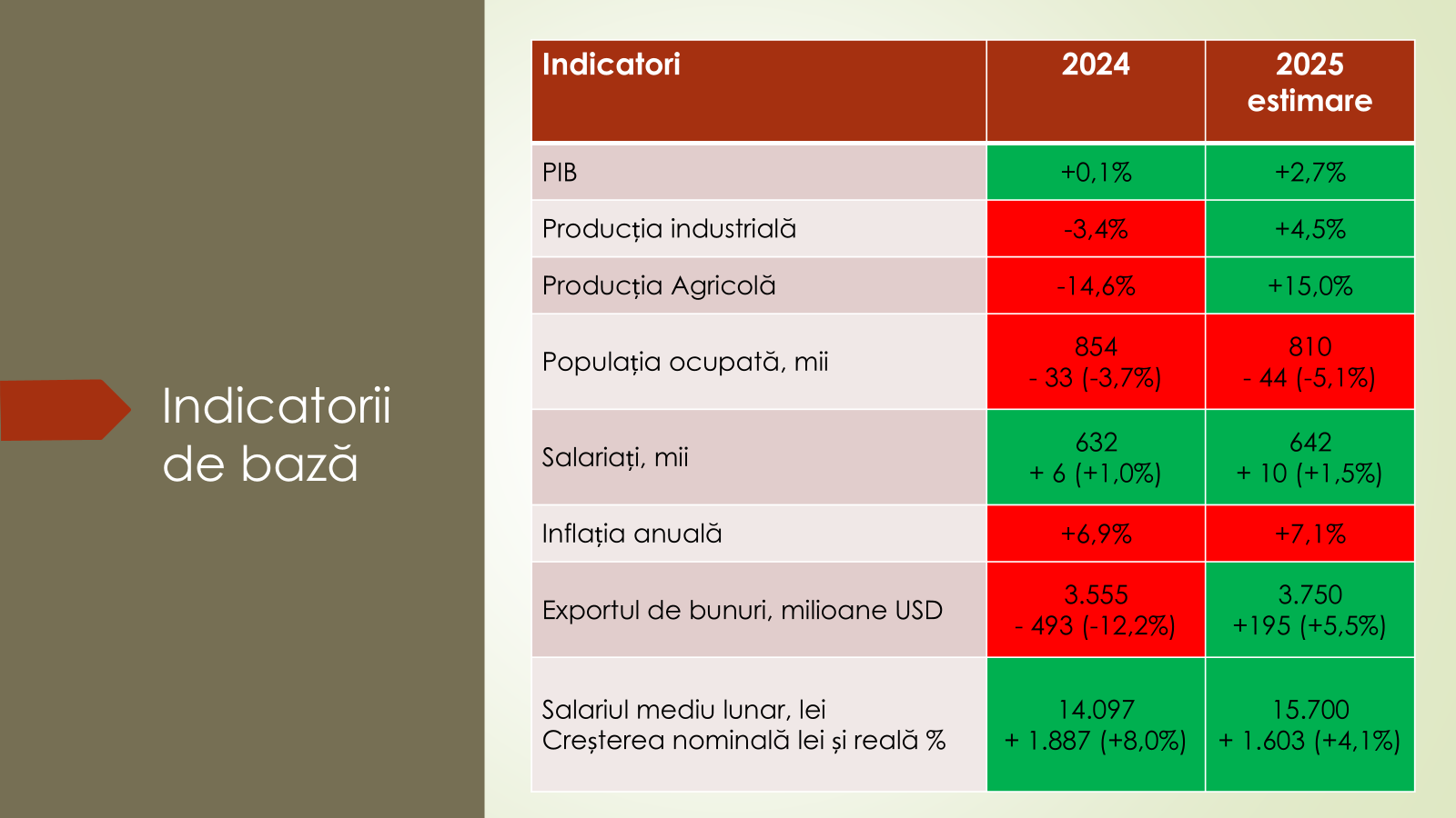 Pe piața muncii, populația ocupată continuă să scadă, cu un minus de 77 de mii de persoane în ultimii doi ani, în special în sectorul agrar, fenomen alimentat de migrația externă. În schimb, numărul salariaților ar putea crește în 2025 cu aproximativ 10 mii de persoane. Exporturile de bunuri și servicii vor atinge în acest an circa 6,8 miliarde de dolari, după doi ani de declin. Pentru prima dată în istoria țării, exporturile de servicii vor depăși 3 miliarde de dolari, fiind principalul motor al creșterii, în timp ce exporturile de bunuri se vor apropia de 3,8 miliarde de dolari, înregistrând o revenire modestă.