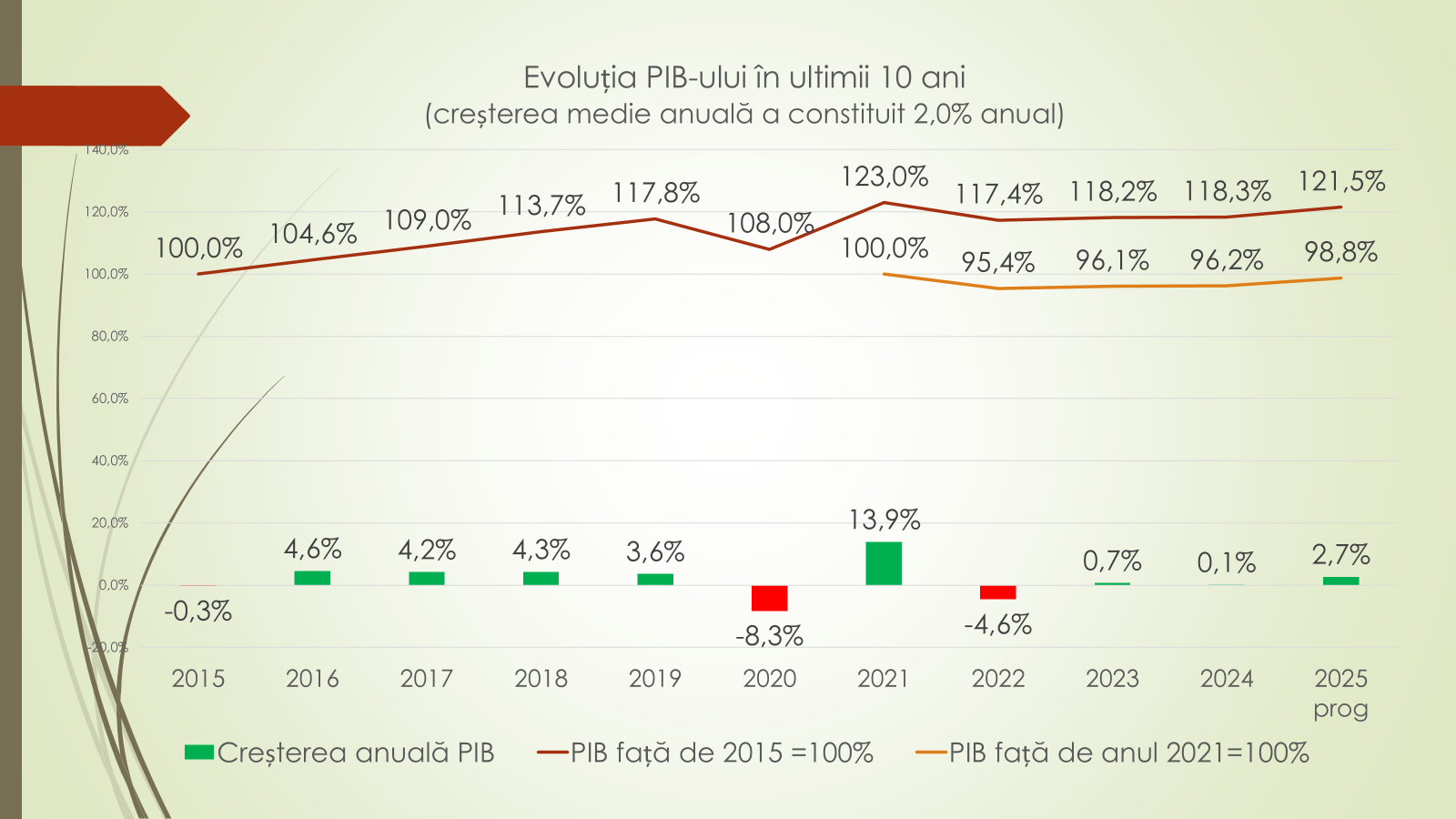 Potrivit estimărilor expertului, Produsul Intern Brut (PIB) va înregistra în 2025 o creștere de 2,7%, comparativ cu doar 0,1% în 2024, evoluție determinată în mare parte de recuperarea sectorului agricol. Cu toate acestea, PIB-ul Republicii Moldova nu va atinge nici în acest an nivelul de dinaintea războiului declanșat de către Federația Rusă împotriva Ucrainei. Creșterea medie anuală a PIB-ului în ultimii cinci ani a fost de doar 0,5%, semnificativ sub media globală.