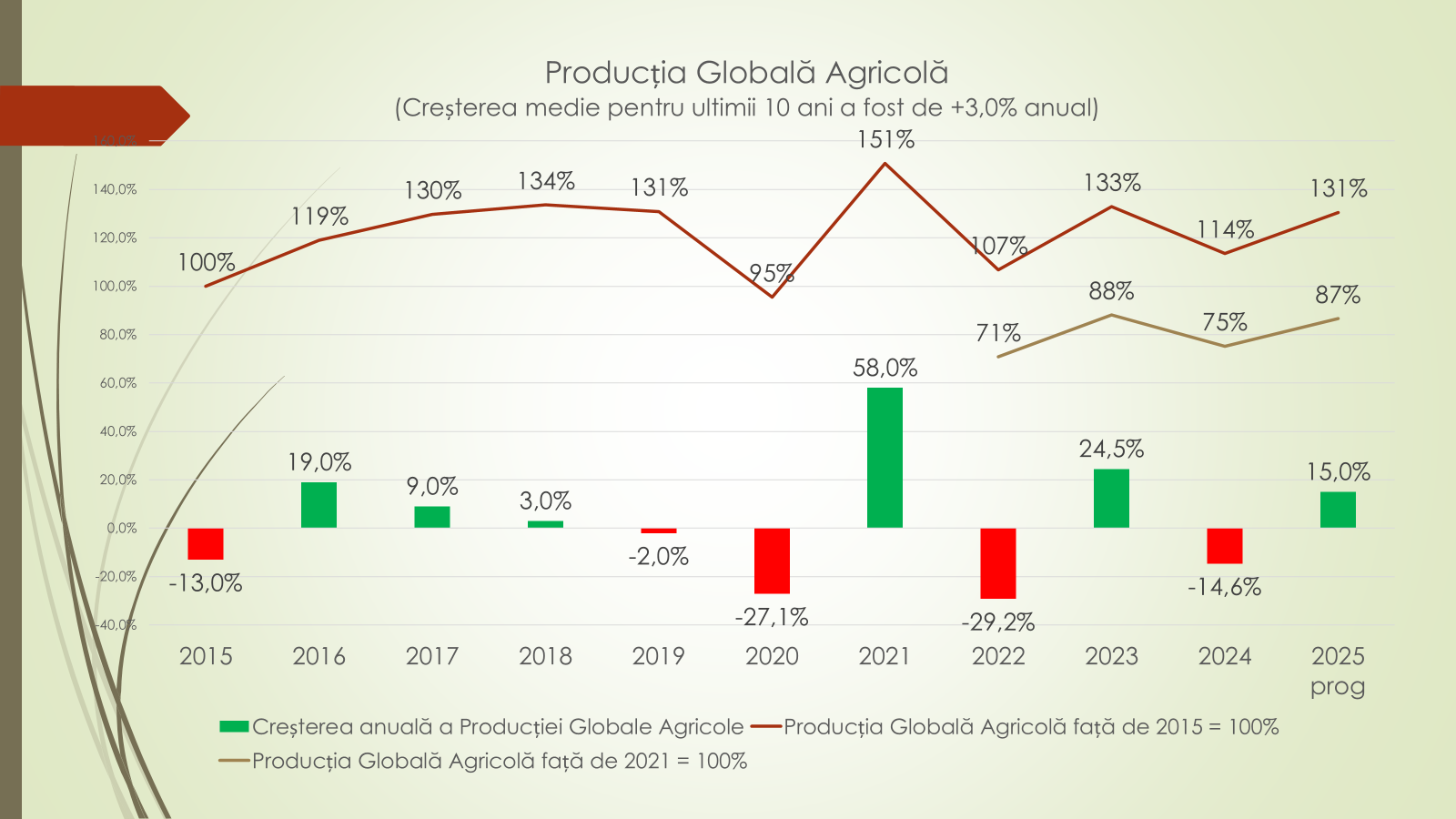 Producția industrială este estimată să crească în 2025 cu 4,5%, după trei ani de declin. Chiar și așa, nivelul producției industriale va rămâne la aproximativ 92% față de maximul istoric din 2021, iar în ultimii zece ani creșterea cumulată a fost de doar 8%, o evoluție catalogată drept îngrijorătoare. În agricultură, după o scădere accentuată în 2024, este anticipată o recuperare de circa 15% în 2025. Expertul atrage însă atenția asupra dependenței excesive de condițiile climatice, subliniind necesitatea dezvoltării zootehniei și a procesării produselor agricole cu valoare adăugată înaltă, pentru a reduce vulnerabilitatea sectorului.