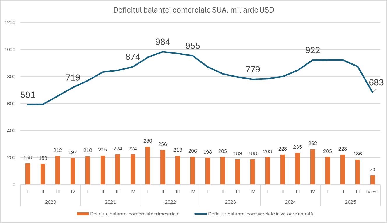 În timp ce în Republica Moldova deficitul balanței comerciale continuă să crească într-un ritm alarmant, în Statele Unite ale Americii anul 2025 a adus un fenomen rar: o corecție masivă a deficitului comercial.