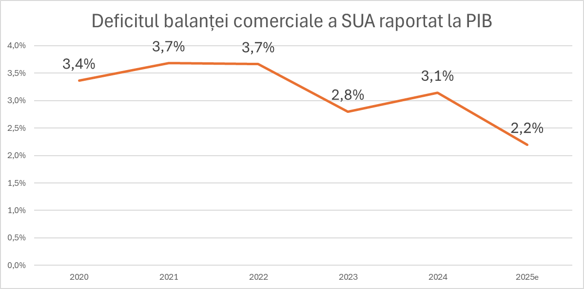• În perioada 2020–2022, deficitul comercial al SUA era de 3,5–3,7% din PIB.