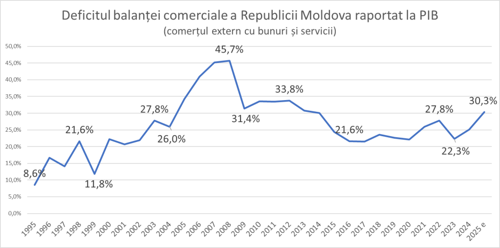 • În anul 2025, deficitul balanței comerciale a Republicii Moldova a depășit 30% din PIB.