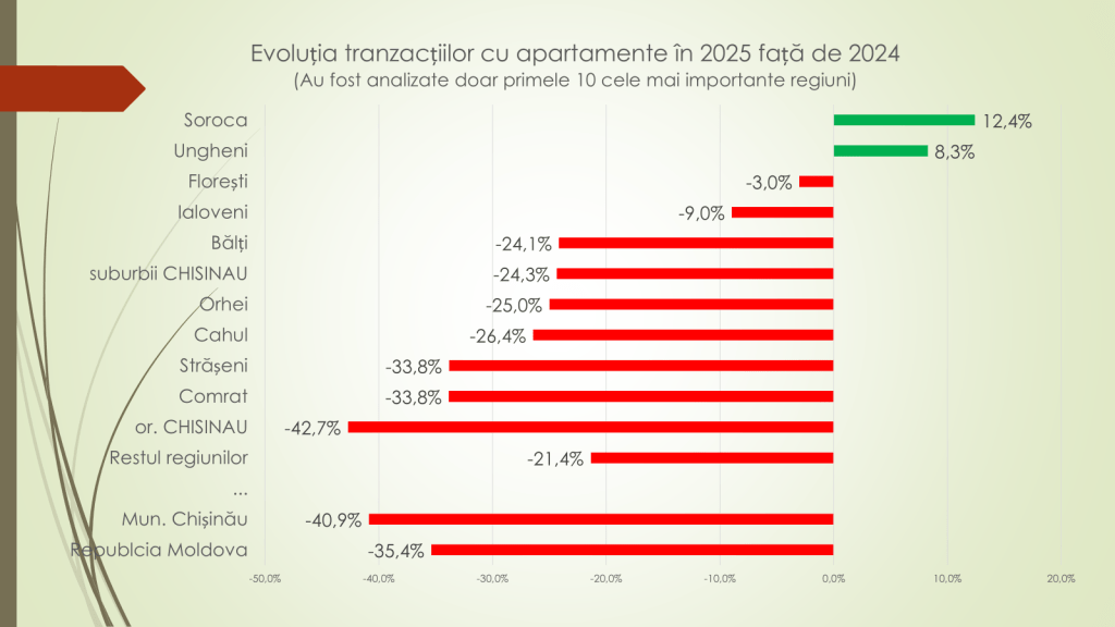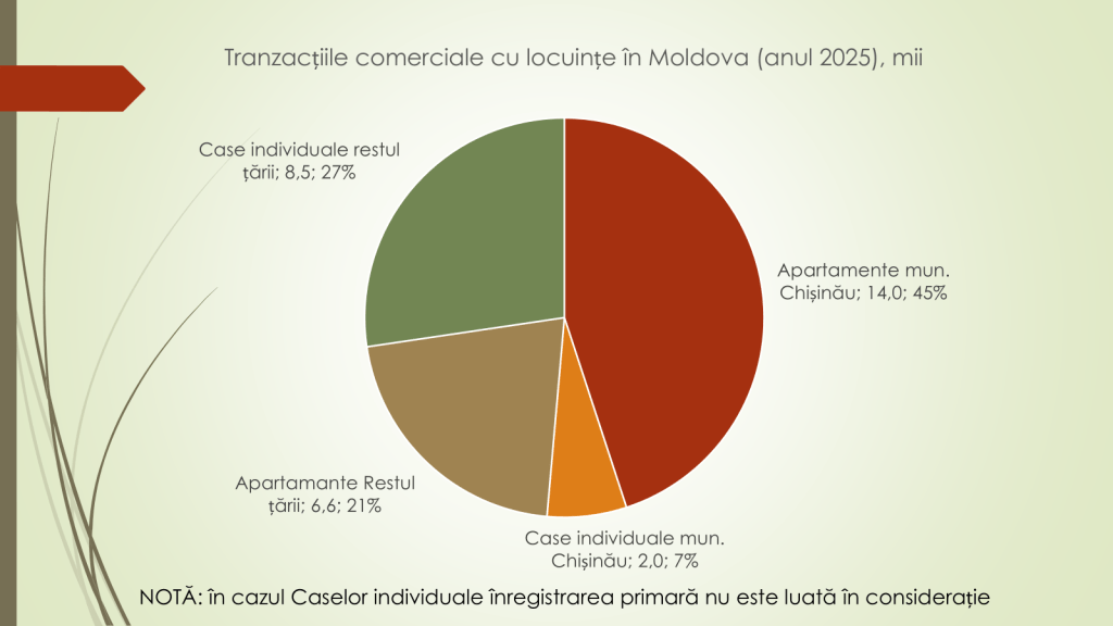 Structura tranzacțiilor din 2025 arată astfel: apartamente în municipiul Chișinău – 14 000 (45%); case individuale în restul țării – 8 500 (27%); apartamente în restul țării – 6 600 (21%); și case individuale în municipiul Chișinău – 2 000 (7%). „În timp ce tranzacțiile cu case individuale au înregistrat variații mai reduse, apartamentele sunt principalul factor al declinului pieței”, a spus Veaceslav Ioniță.