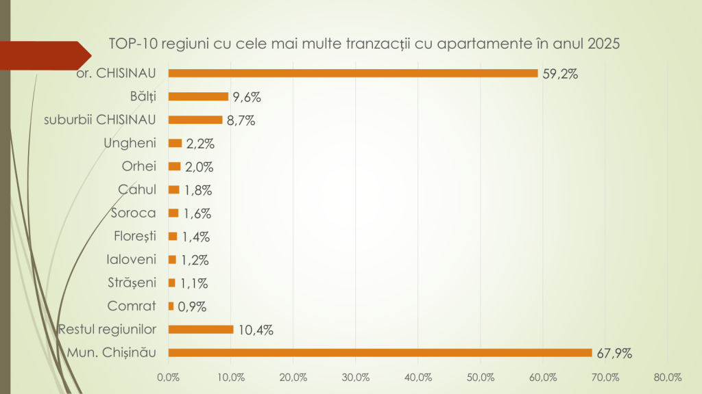 Regiunile cu cele mai multe tranzacții de apartamente în 2025 au fost: Chișinău – 59,2%; Bălți – 9,6%; suburbiile Chișinăului – 8,7%; Ungheni – 2,2%; Orhei – 2%, iar restul raioanelor – sub 2%. „Numărul redus de tranzacții generează incertitudini privind prețurile, contribuind totodată la menținerea unor valori ridicate pe piața imobiliară”, a menționat expertul.