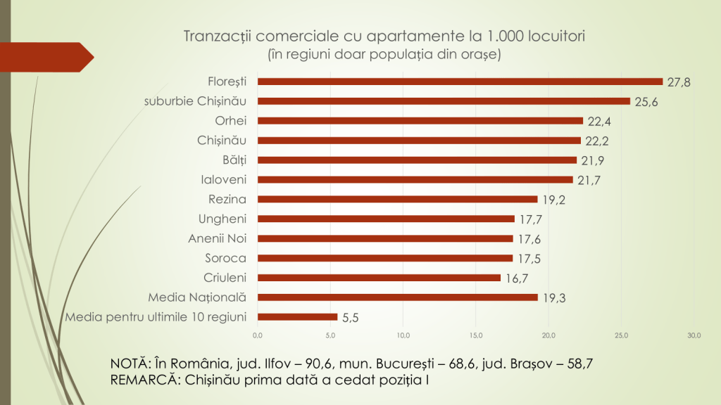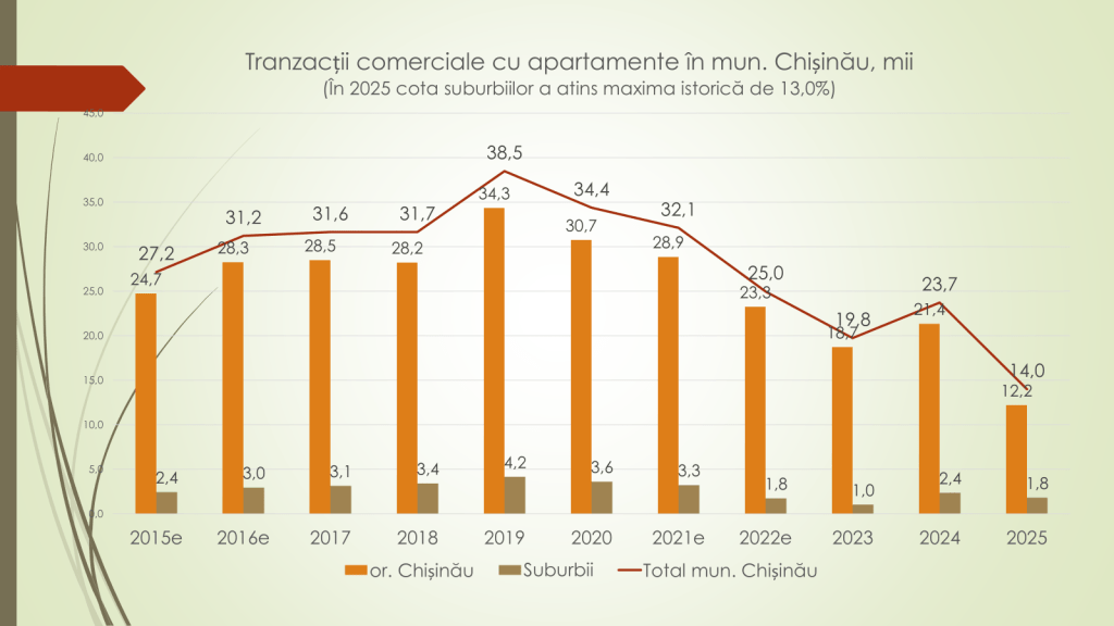 Dacă anterior, susține economistul, majoritatea tranzacțiilor imobiliare aveau loc în municipiul Chișinău, anul 2025 marchează o aproape egalizare între capitală și restul țării. Comparativ cu anul 2019, când în Chișinău se realizau aproape 40 de mii de tranzacții, în 2025 numărul acestora a scăzut la 16 500, față de 14 700 în restul republicii. În același timp, suburbiile Chișinăului devin tot mai active pe piața imobiliară, în contextul îngustării pieței din capitală.