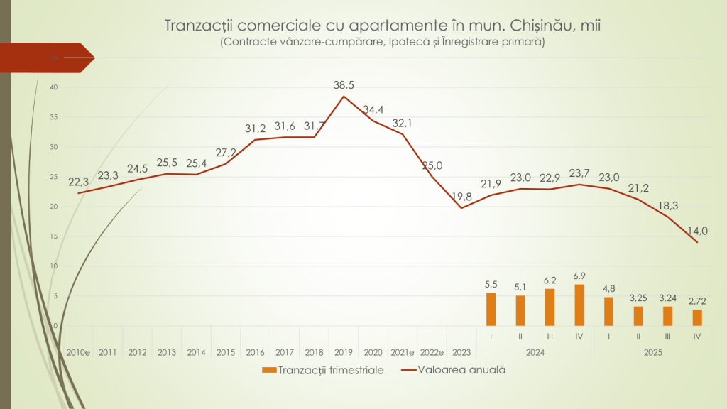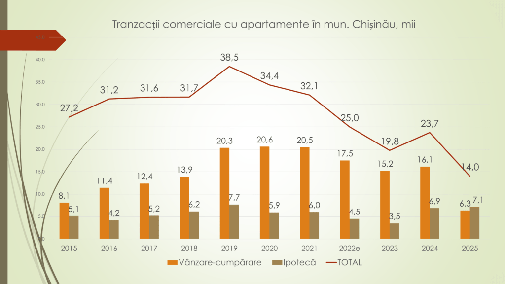 Cel mai afectat segment al pieței, spune Veaceslav Ioniță, rămâne cel al apartamentelor, în special din municipiul Chișinău. Numărul tranzacțiilor cu apartamente în capitală a scăzut de la 23 700 în 2024 la 14 000 în 2025, marcând cea mai mică rată din ultimii 15–20 de ani. La nivel național, tranzacțiile cu apartamente au coborât la 20 600, față de peste 52 500 în 2019.