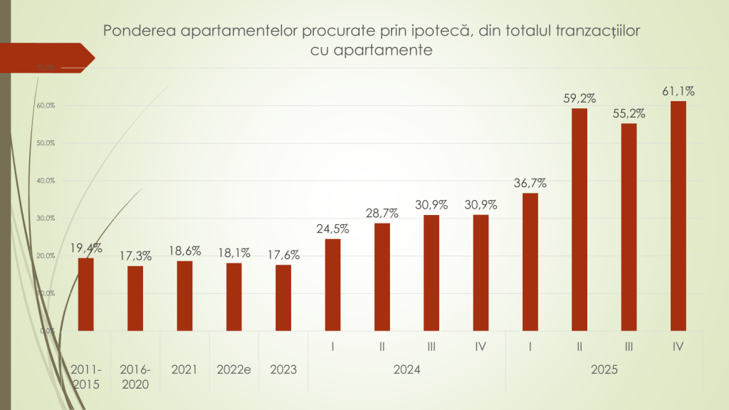 Un fenomen distinct al anului 2025, remarcă analistul economic, este creșterea accentuată a tranzacțiilor realizate prin ipotecă, în paralel cu scăderea achizițiilor făcute integral din surse proprii. Dacă în 2024 au fost 16 100 de tranzacții realizate cu bani disponibili integral, în 2025 numărul acestora a scăzut la 6 300. În schimb, tranzacțiile prin ipotecă au crescut la 7 100, apropiindu-se de nivelul maxim istoric din 2019. Ponderea apartamentelor procurate prin ipotecă a ajuns la 61,1% în 2025, față de 30,9% în 2024 și sub 20% în perioadele anterioare.