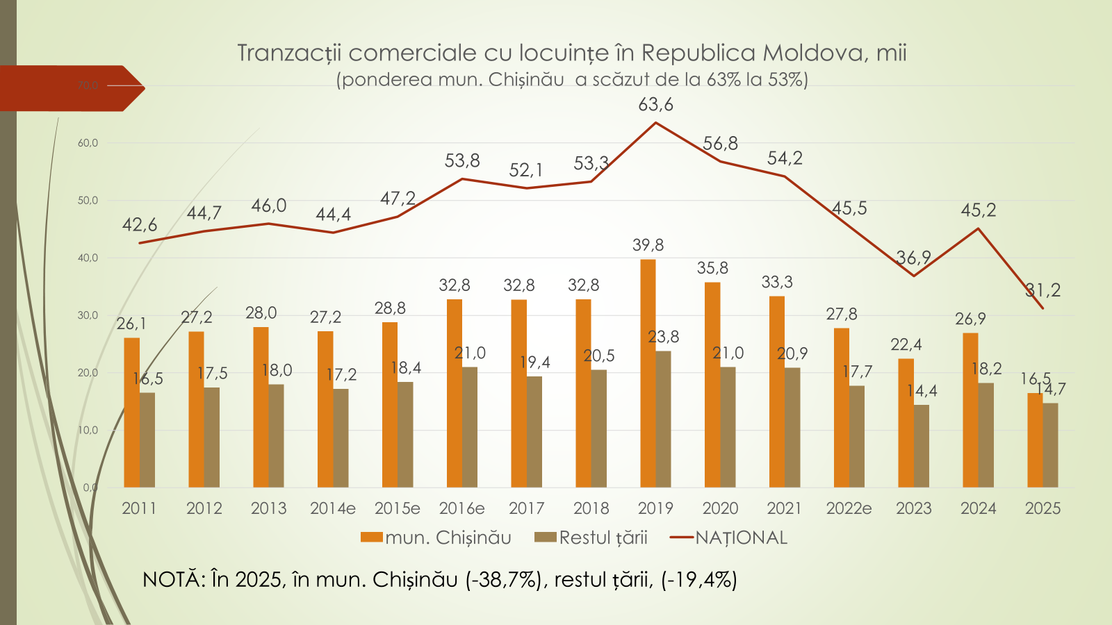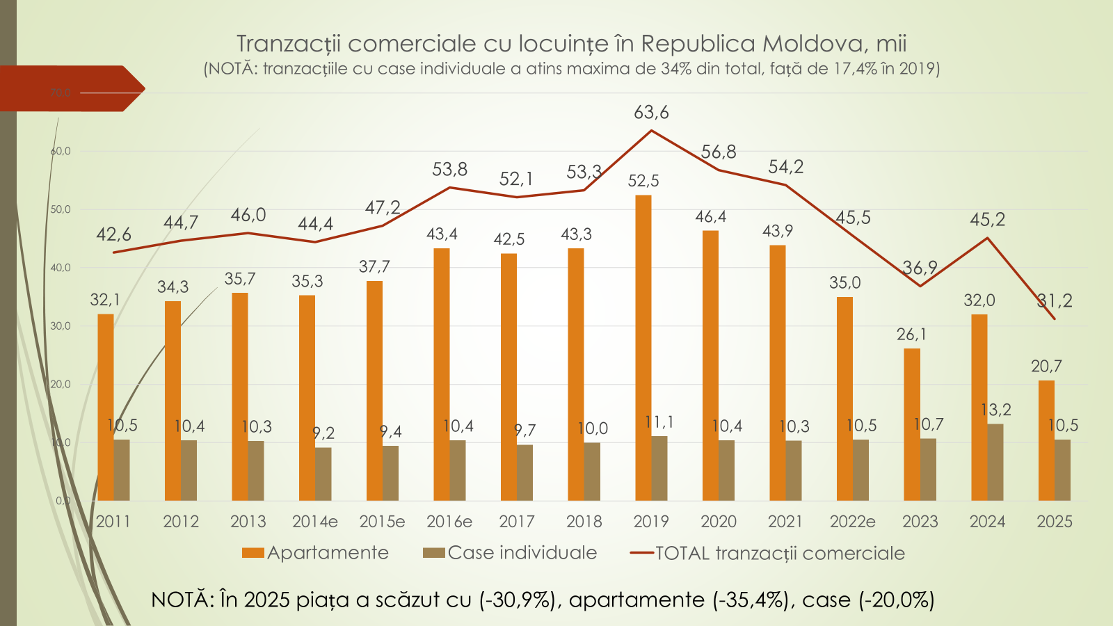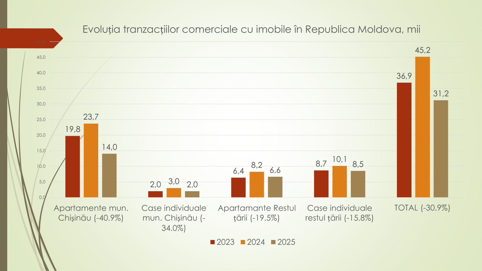 Structura tranzacțiilor din 2025 arată astfel: apartamente în municipiul Chișinău – 14 000 (45%); case individuale în restul țării – 8 500 (27%); apartamente în restul țării – 6 600 (21%); și case individuale în municipiul Chișinău – 2 000 (7%). „În timp ce tranzacțiile cu case individuale au înregistrat variații mai reduse, apartamentele sunt principalul factor al declinului pieței”, a spus Veaceslav Ioniță.