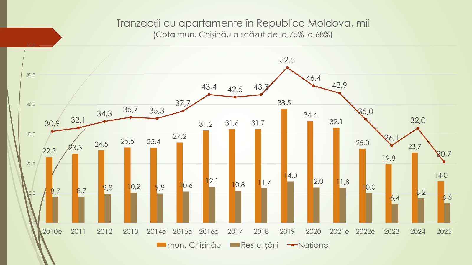 Cel mai afectat segment al pieței, spune Veaceslav Ioniță, rămâne cel al apartamentelor, în special din municipiul Chișinău. Numărul tranzacțiilor cu apartamente în capitală a scăzut de la 23 700 în 2024 la 14 000 în 2025, marcând cea mai mică rată din ultimii 15–20 de ani. La nivel național, tranzacțiile cu apartamente au coborât la 20 600, față de peste 52 500 în 2019.