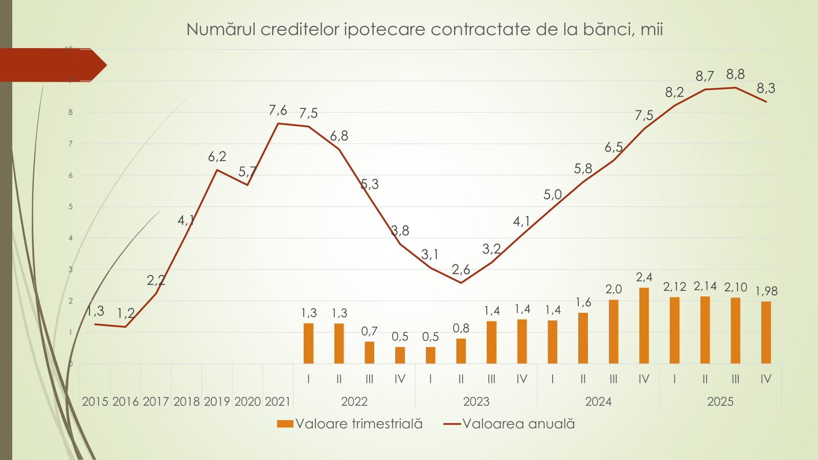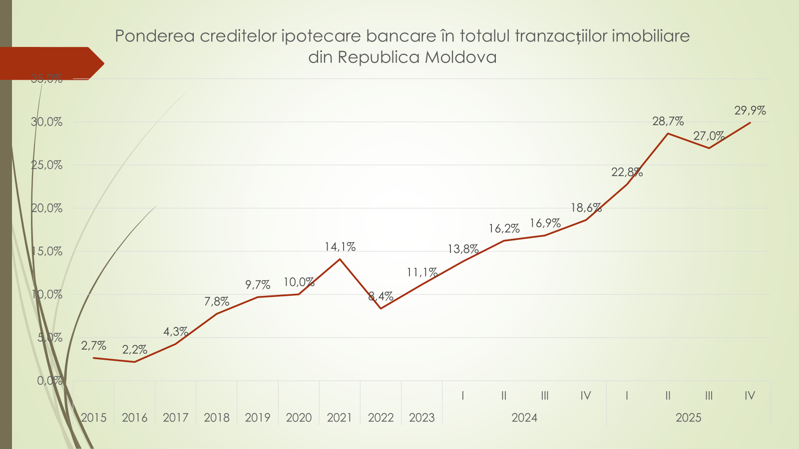 Potrivit lui Veaceslav Ioniță, numărul creditelor ipotecare contractate de la bănci a atins un nou record, 8 300 în 2025, cu o medie de cel puțin 2 000 de credite acordate trimestrial. Astfel, ponderea creditelor ipotecare în totalul tranzacțiilor imobiliare a crescut la 29,9%, comparativ cu 18,6% în 2024.