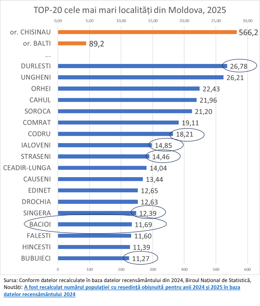 Această evoluție nu este întâmplătoare. Ea reflectă un fenomen economic clar: concentrare urbană accelerată în jurul Chișinăului. Din top 20 cele mai mari localități din Moldova, 8 fac parte din aglomerația urbană a capitalei. Creștere demografică semnificativă se înregistrează aproape exclusiv în această zonă.
