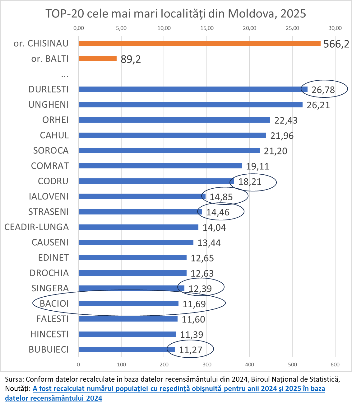 Această evoluție nu este întâmplătoare. Ea reflectă un fenomen economic clar: concentrare urbană accelerată în jurul Chișinăului. Din top 20 cele mai mari localități din Moldova, 8 fac parte din aglomerația urbană a capitalei. Creștere demografică semnificativă se înregistrează aproape exclusiv în această zonă.