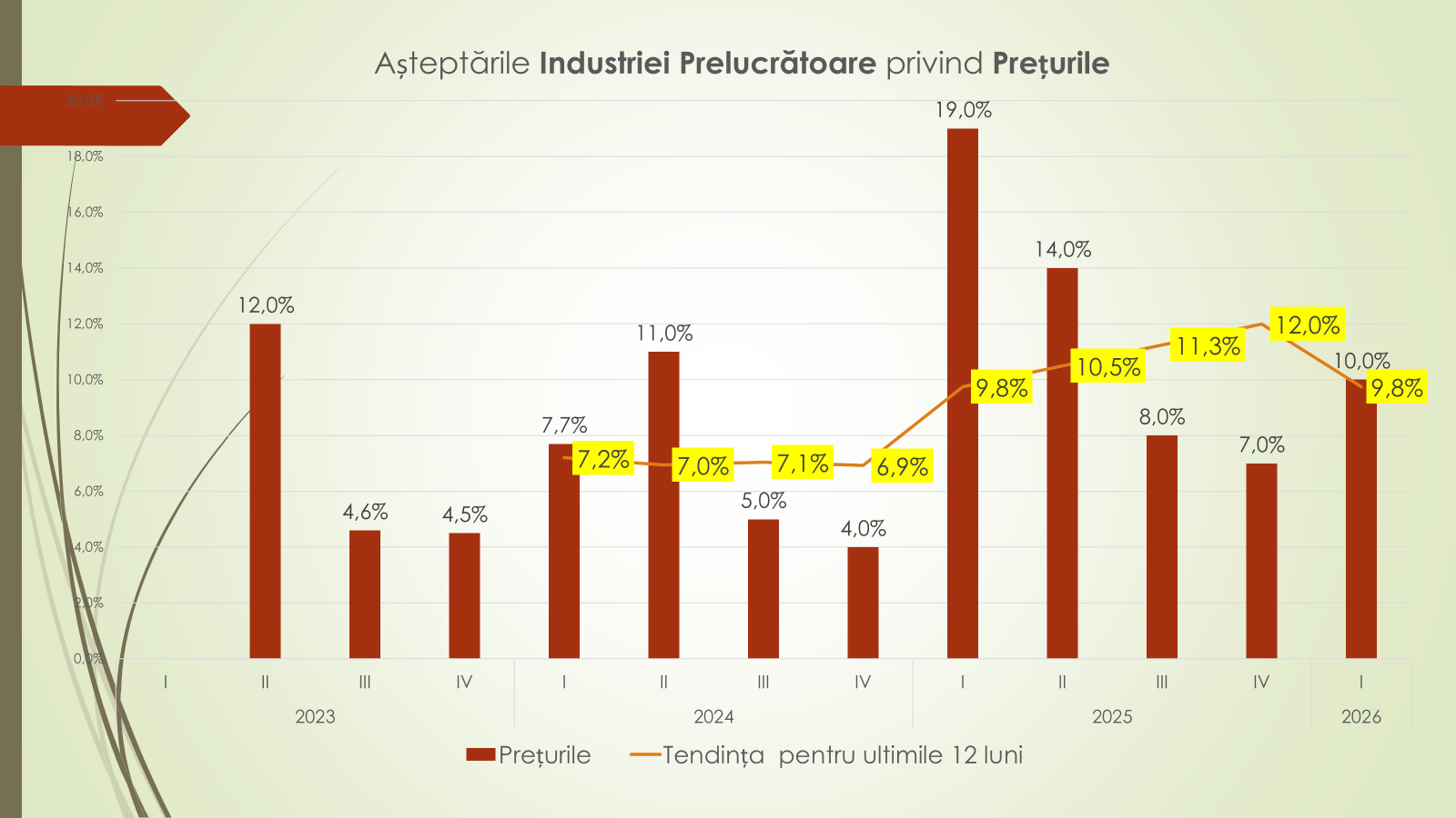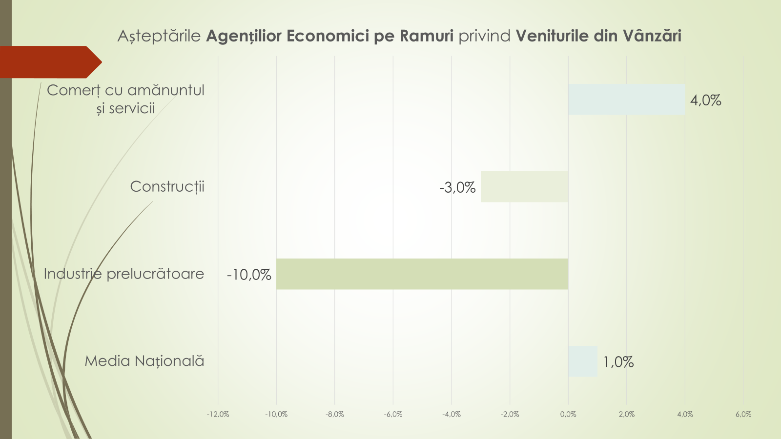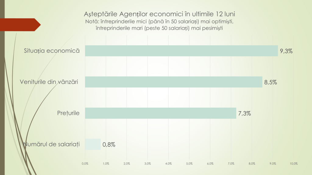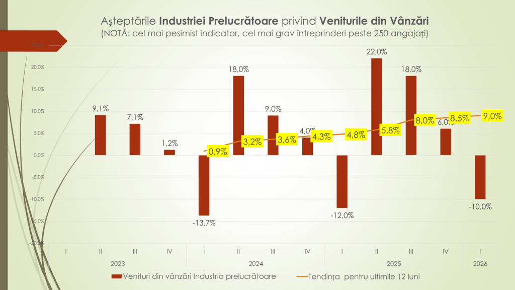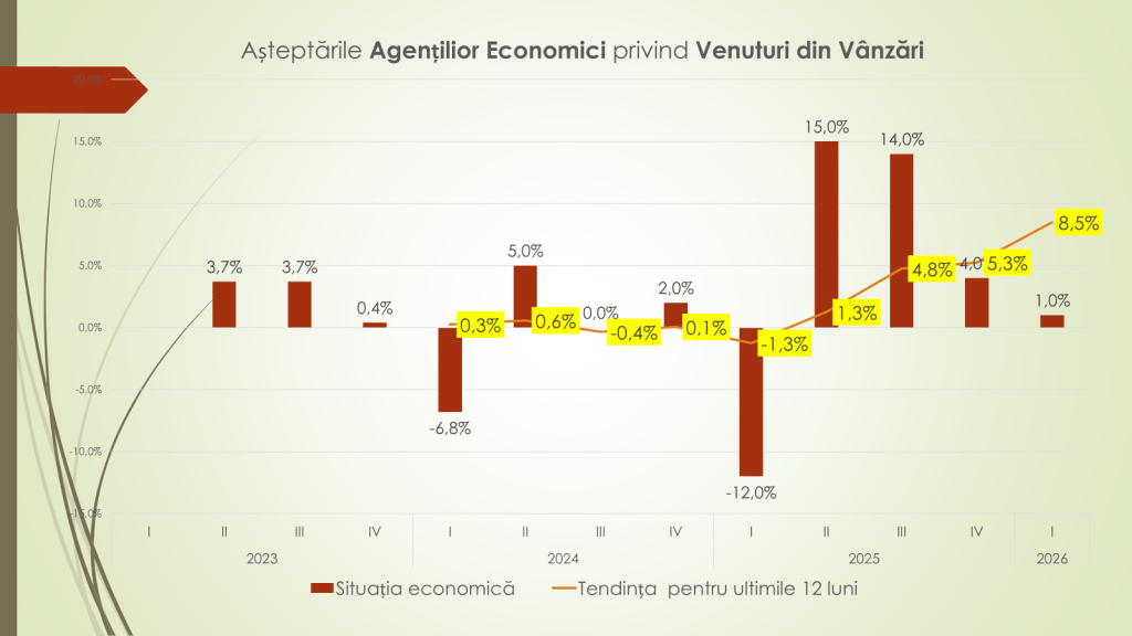 În anii precedenți, potrivit economistului, începuturile de an au fost marcate de rezerve mai pronunțate: –6,8% în trimestrul I 2024 și –12% în trimestrul I 2025. În prezent, tendința ultimelor 12 luni indică o redresare – de la –1,3% la +8,5%. Pe ramuri, industria prelucrătoare rămâne cea mai afectată, anticipând o scădere moderată a veniturilor din vânzări (–10%), în special pe fondul dificultăților din industria alimentară. În schimb, celelalte ramuri majore estimează stabilitate.