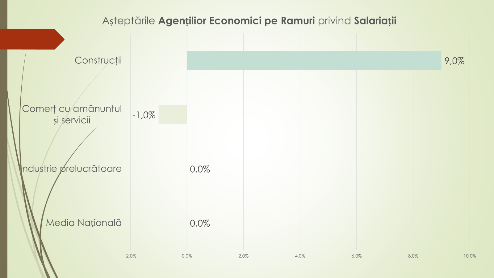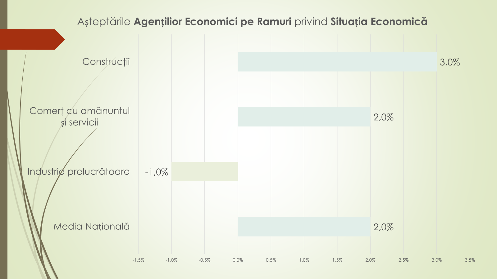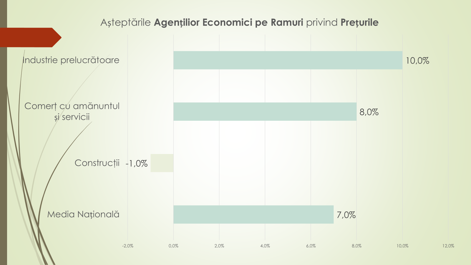 În anii precedenți, potrivit economistului, începuturile de an au fost marcate de rezerve mai pronunțate: –6,8% în trimestrul I 2024 și –12% în trimestrul I 2025. În prezent, tendința ultimelor 12 luni indică o redresare – de la –1,3% la +8,5%. Pe ramuri, industria prelucrătoare rămâne cea mai afectată, anticipând o scădere moderată a veniturilor din vânzări (–10%), în special pe fondul dificultăților din industria alimentară. În schimb, celelalte ramuri majore estimează stabilitate.
