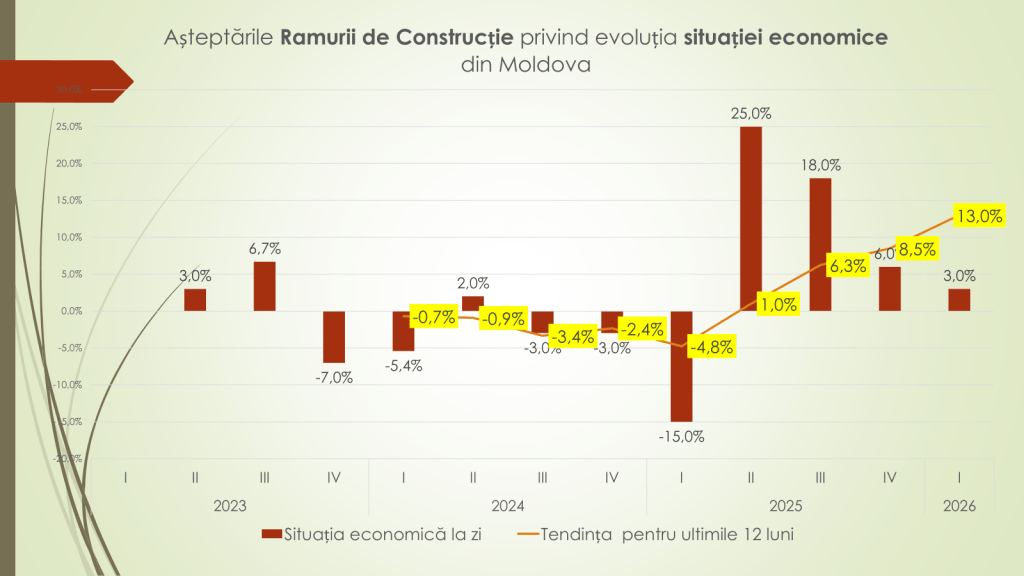 Majoritatea ramurilor economiei, susține expertul, anticipează o situație stabilă în primul trimestru al anului 2026. Excepția o constituie industria prelucrătoare, care estimează o ușoară deteriorare (–1%). În sectorul construcțiilor, percepțiile s-au îmbunătățit semnificativ: de la –15% în trimestrul I 2025 la +3% în trimestrul I 2026, indicând o revenire a încrederii. În ceea ce privește veniturile din vânzări, agenții economici estimează o evoluție stabilă în primele trei luni ale anului 2026, cu o apreciere marginal pozitivă de +1%, comparativ cu +4% în trimestrul IV 2025.