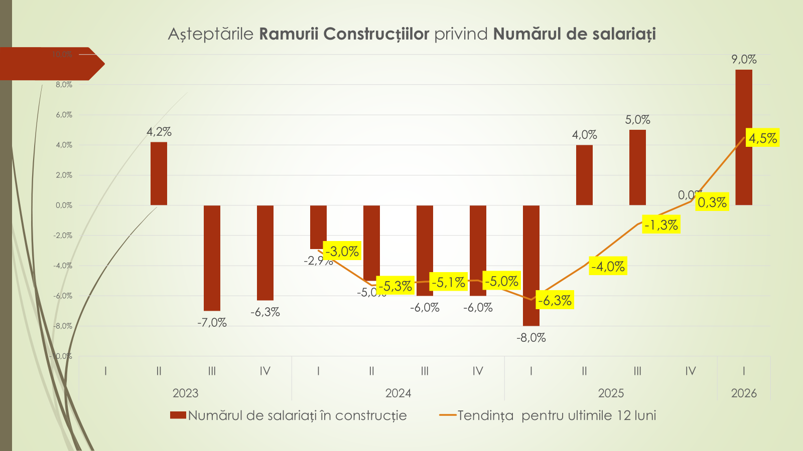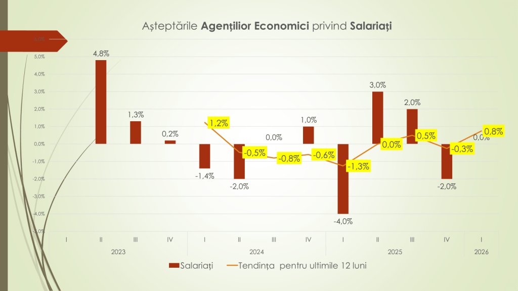 Piața forței de muncă, susține analistul economic, este percepută ca fiind stabilă (0%) în trimestrul I 2026. Totuși, comparativ cu începutul anilor 2024 și 2025, când se anticipau scăderi de –1,4% și –4%, situația actuală este mai favorabilă. Tendința anuală indică o evoluție de la –1,3% la +0,8%. Sectorul construcțiilor este cel mai optimist, estimând o creștere a numărului de salariați de la –8% în trimestrul I 2025 la +9% în trimestrul I 2026. Comerțul cu amănuntul și serviciile prevăd o ușoară scădere (–1%), iar industria prelucrătoare – stagnare.