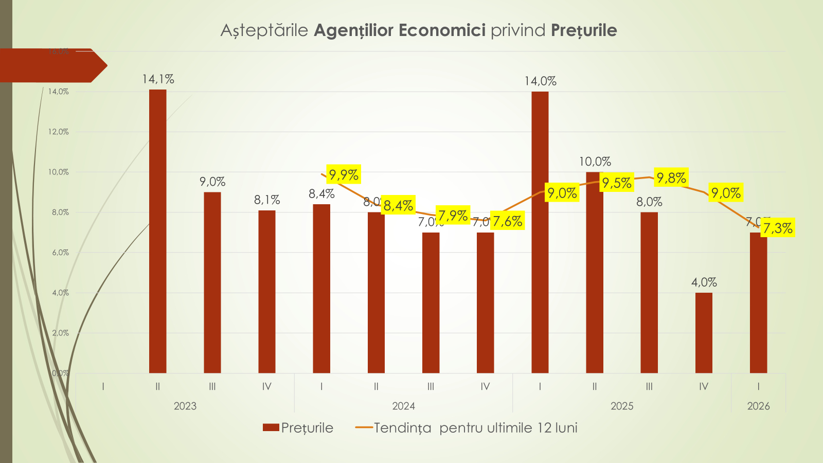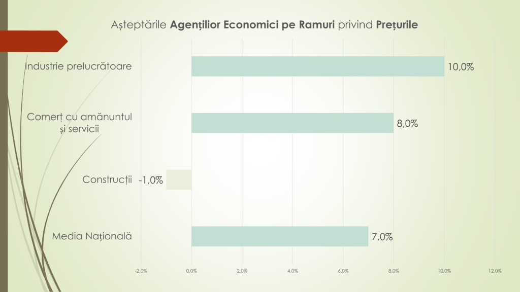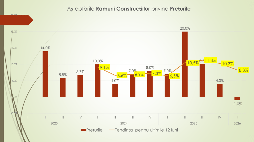 Pentru primele trei luni ale anului 2026, afirmă Veaceslav Ioniță, agenții economici estimează o creștere moderată a prețurilor, de circa 7%. Tendința ultimului an indică o reducere a presiunii inflaționiste – de la 9% în trimestrul I 2025 la 7,3% în trimestrul I 2026. Cele mai mari așteptări de creștere a prețurilor se regăsesc în industria prelucrătoare (+10%), urmată de comerț și servicii (+8%). În construcții, se anticipează o ușoară scădere a prețurilor (–1%).