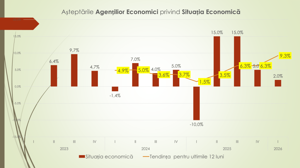 Datele BNS, colectate trimestrial de peste trei ani, reflectă așteptările oamenilor de afaceri privind evoluția imediată a situației economice. La începutul anului 2026, sentimentul general este „stabil pozitiv”, cu un indicator de circa +2%, ceea ce semnifică o percepție de menținere a situației într-o zonă ușor favorabilă. În perioada 2023–2025, cea mai ridicată valoare a optimismului a fost de +15% (trimestrele II și III 2025), în timp ce minimul istoric a fost atins în trimestrul III 2025, cu –10%. În trimestrul IV 2025, indicatorul a revenit la +5%. Tendința ultimelor 12 luni arată o îmbunătățire clară: de la –10% în trimestrul I 2025 la +9,3% în trimestrul I 2026.