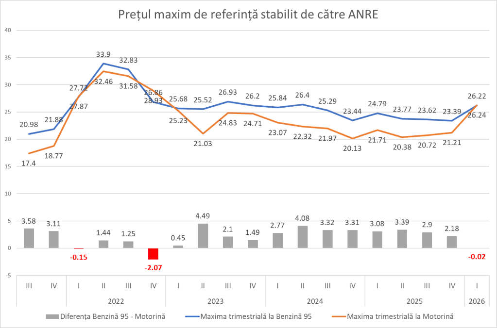 Graficul confirmă clar această evoluție. Diferența tradițională dintre benzină și motorină, care în mod normal este de câțiva lei pe litru, s-a evaporat complet.