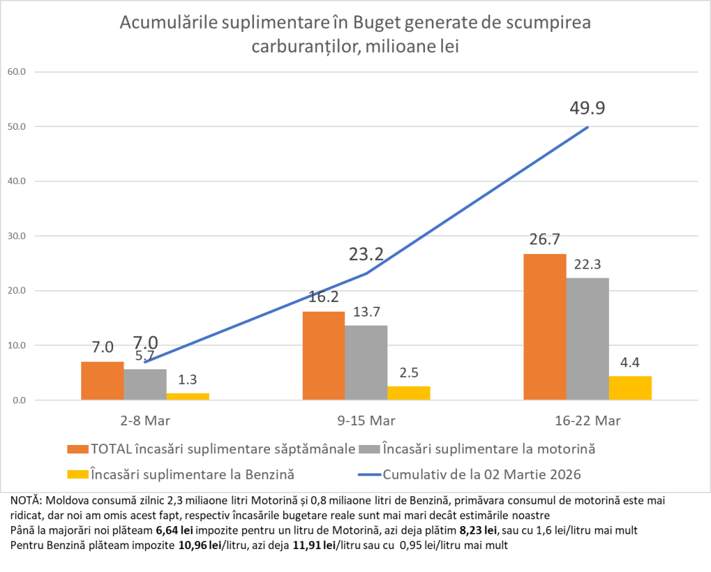 În perioada 16–22 martie, saltul este și mai puternic: 26,7 milioane lei într-o singură săptămână, dintre care 22,3 milioane lei vin din motorină și 4,4 milioane lei din benzină. Astfel, totalul acumulat suplimentar din 2 martie până la 22 martie ajunge la 49,9 milioane lei.