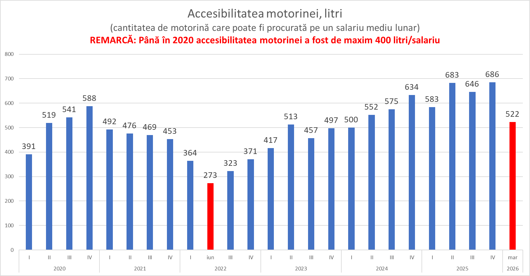În 2022, la vârful prețurilor, accesibilitatea motorinei a coborât la doar 273 litri per salariu mediu. Astăzi, chiar după această explozie de preț, suntem la 522 litri – aproape dublu.